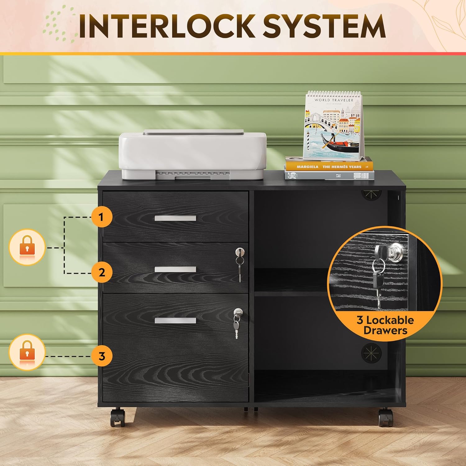 - Multifunctional File Cabinet with Lock: This file cabinet features open storage spaces, file drawers, and storage cabinets, allowing you to organize office equipment, papers, files, and supplies neatly. It is equipped with 2 locks, identifying 3 lockable drawers to keep your personal belongings secure.