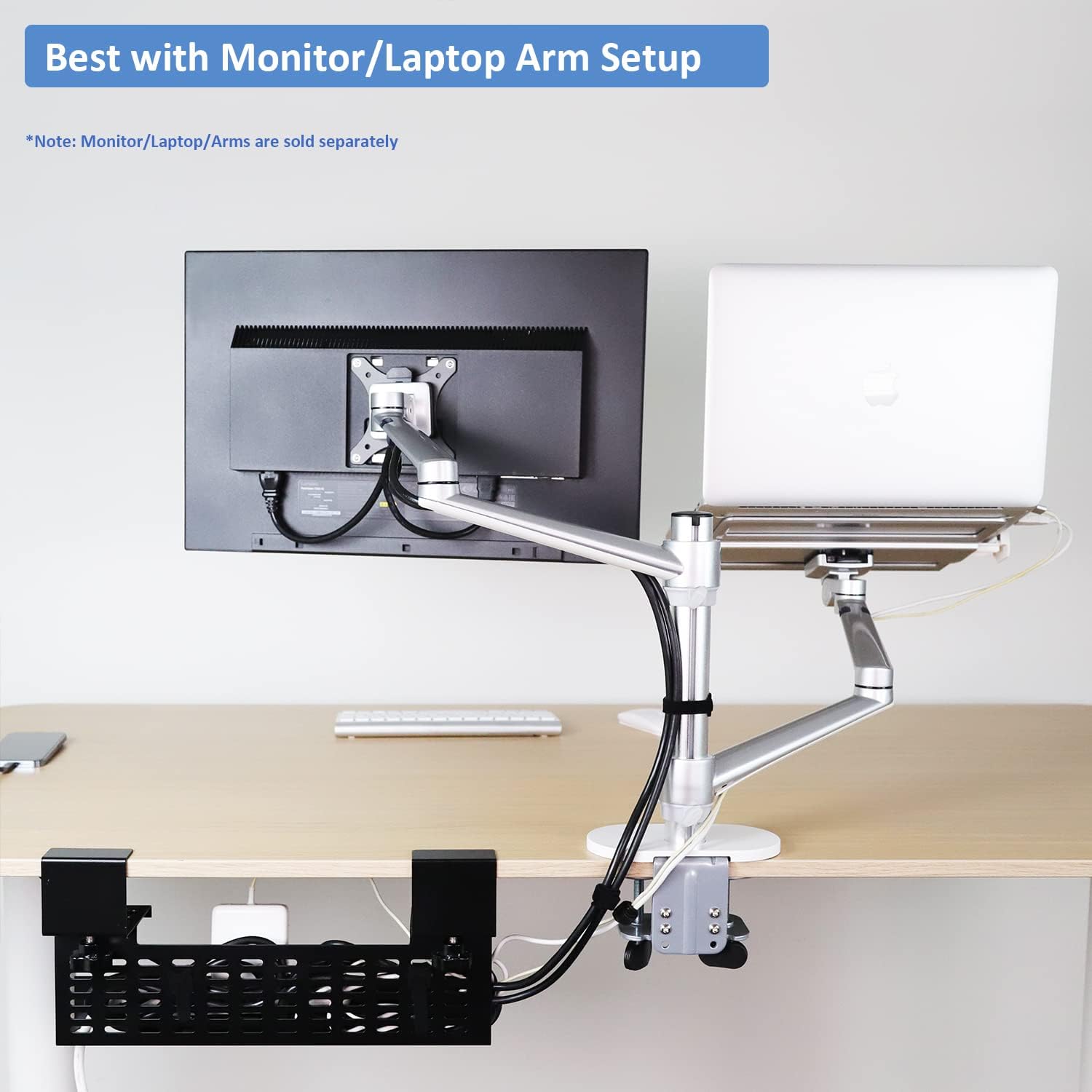 - ACCESSORIES INCLUDED: Under Desk Cable Management Tray with Mounting Clamp Kit, Dimensions: 4.5"H x 16"W x 3"D. Reusable cable ties and screws package.