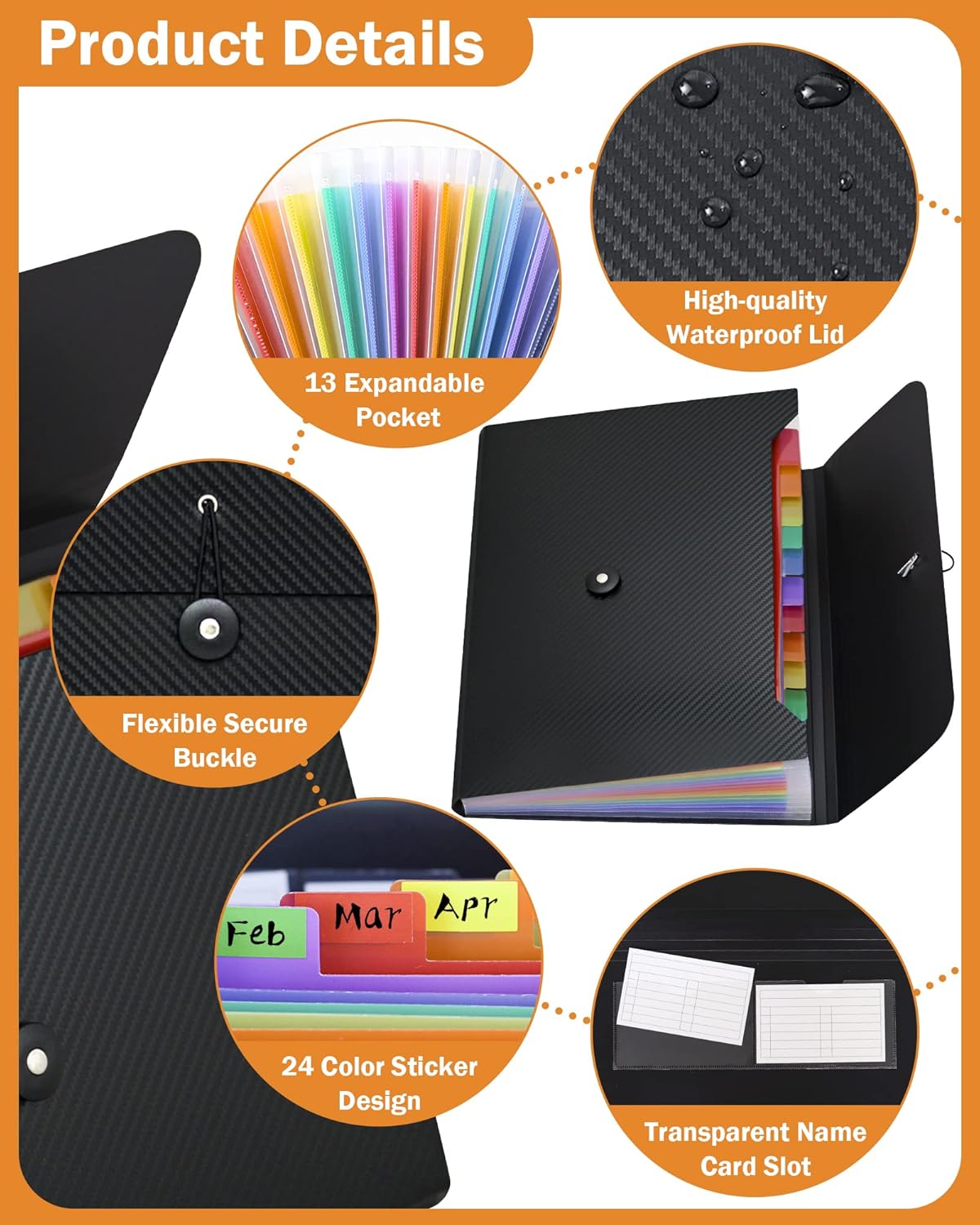 - RAINBOW COLORED DESIGN : 13 Pockets File Folder is updated with nice colored inner pages for better visual sense. small colored labels can give your files a convenient classification, so that you can quickly find the paper you need