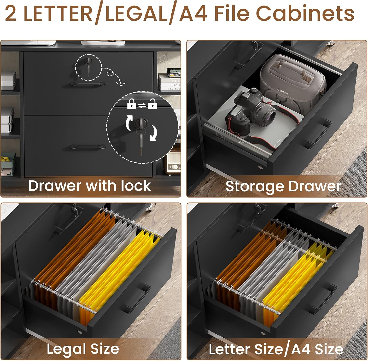 - 📁【What can you get?】 The file cabinet has 2 file drawers with 1 lock for Legal, Letter, A4 sizes standard file, power strip for charging 4 devices at the same time, spacious desktop large enough for printers and scanners, 6 storage shelves, 4 hooks and 4 industrial casters. Filing cabinet that can be combined with any computer desk to form an L-shaped office area.