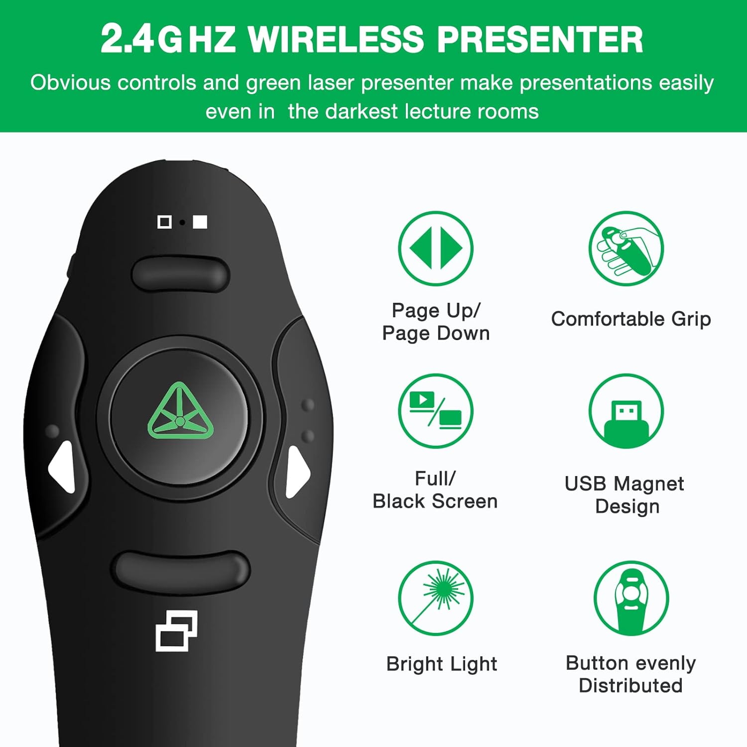 Rechargeable Presentation Clicker Wireless Presenter Remote USB Control Powerpoint PPT Clicker,Green Laser Pointer RF 2.4GHz Presenter Remote Google Slide Advancer for Computer/Laptop/Mac/Keynote
