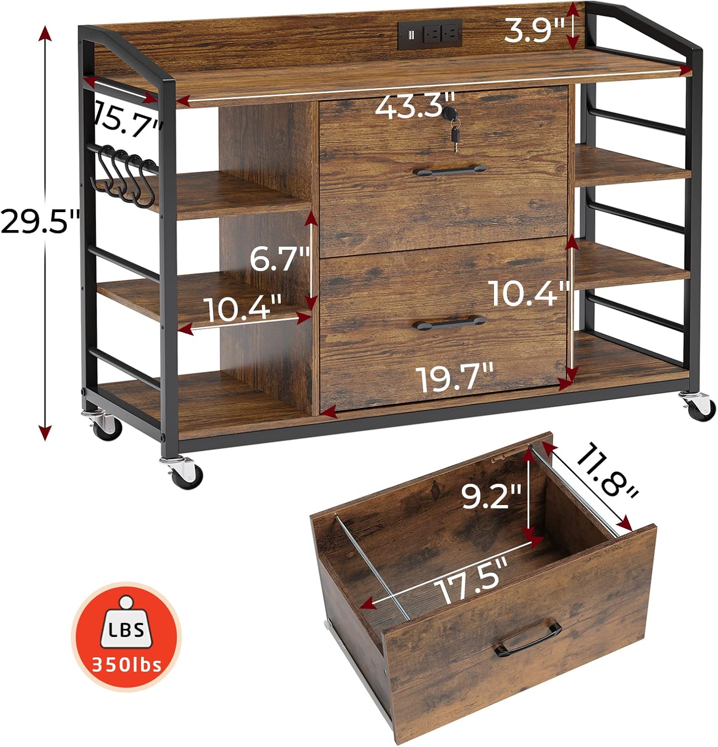 SEDETA 44" File Cabinet, Filing Cabinet fits Legal/Letter Size, 2 Drawer File Cabinets for Home Office with Lock, Power Strip, 6 Storage Shelves, Rustic Brown