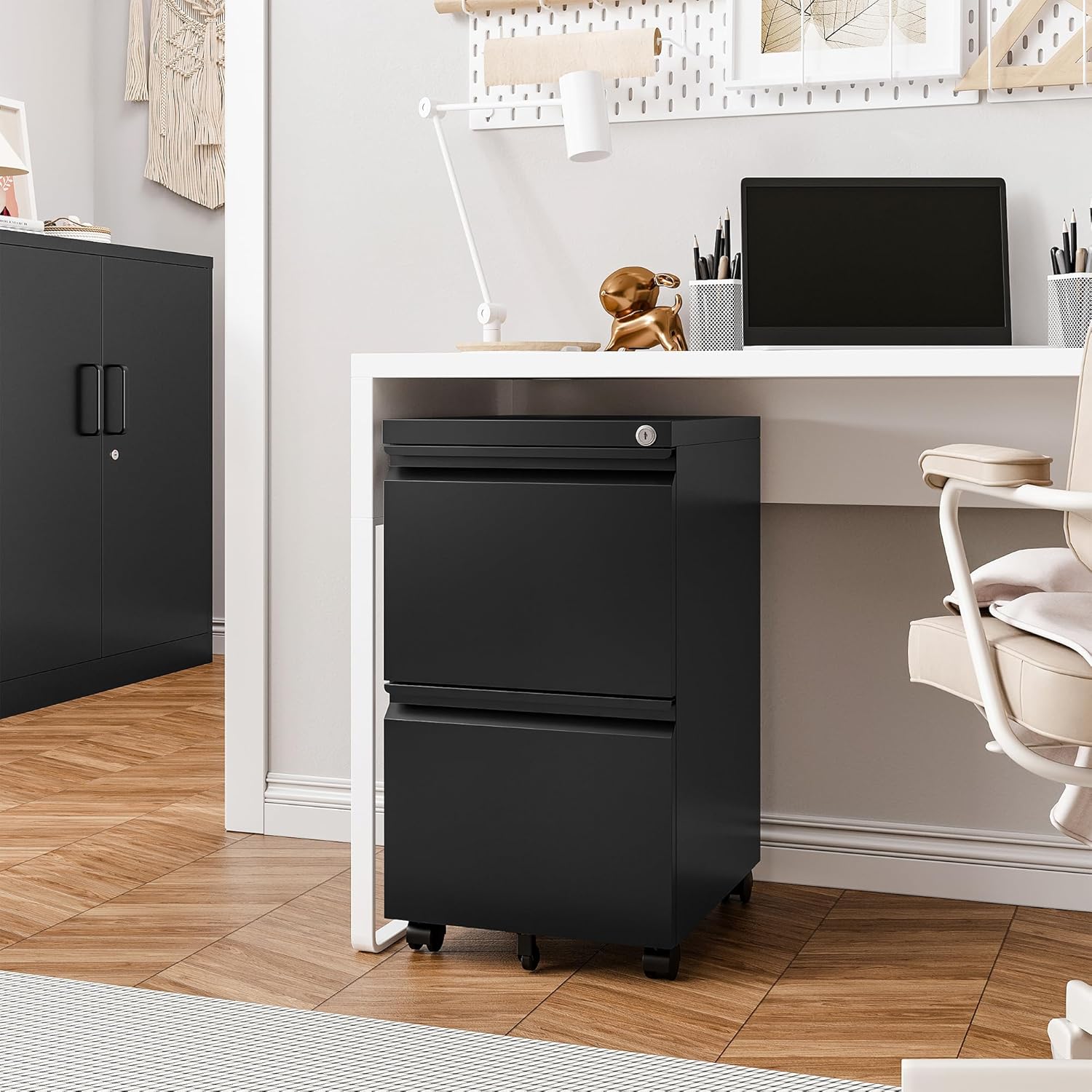 Mobile File Cabinet with Lock - 2 Drawer, Small Rolling Cabinet for Home Office, Legal/Letter/A4 (Black)