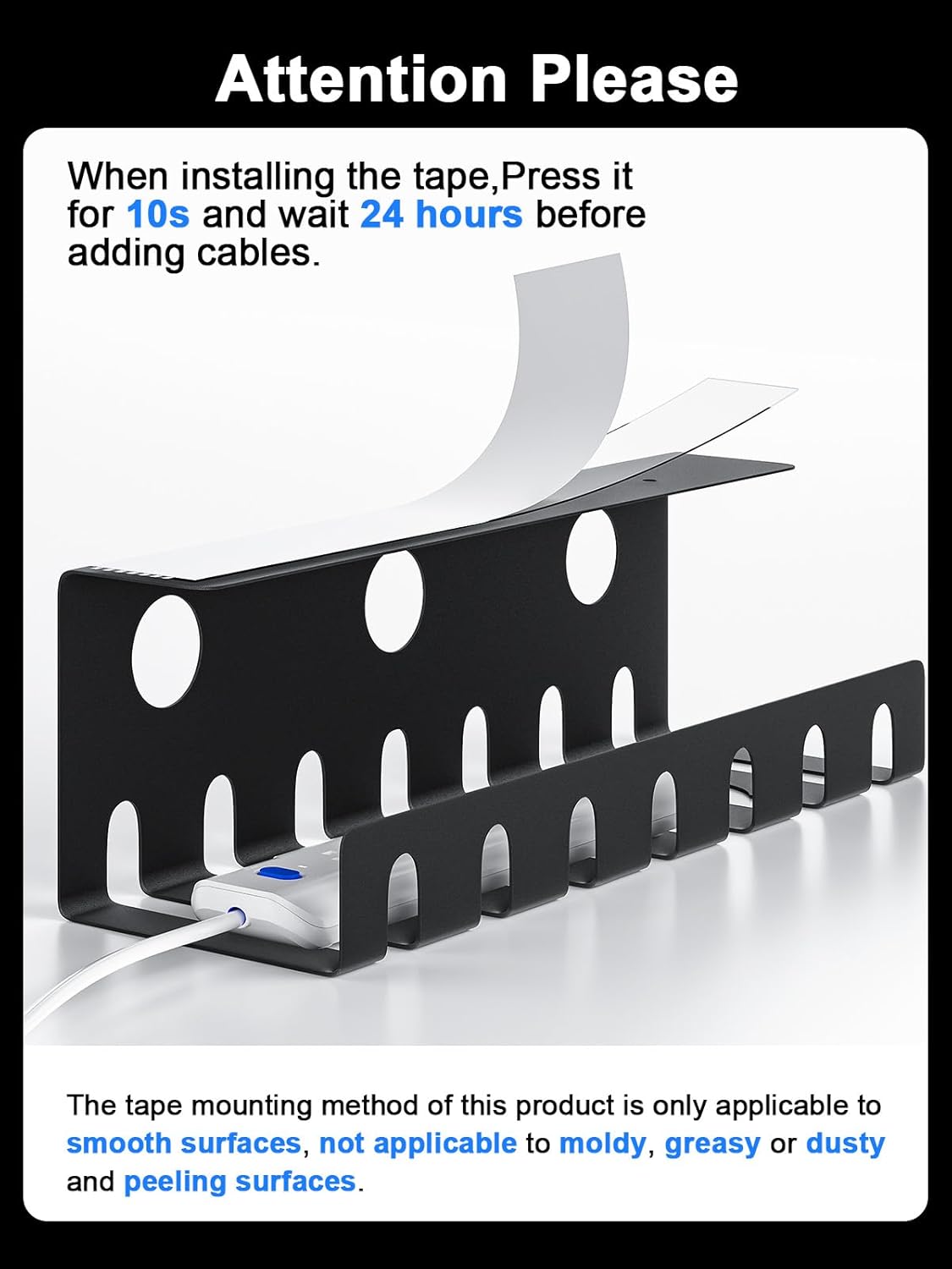 - 【Attention please】: If you choose tape mounting, please note the following three points: 1. To ensure better adhesion of the cable management tray, please make sure to clean the surface before use, the tape should only be applied to clean, dust-free, smooth and flat surfaces; the desk cord organizer is not suitable for dirty, mildewed or peeling surfaces. When installing the cable management under desk with the tape, press firmly for 10 seconds; 2. After installing the under desk cable management, wait 24 hours for the tape to fully cure before placing cables; 3. Make sure the tape is flat and free of wrinkles, which may cause the cord organizer for desk to fall off