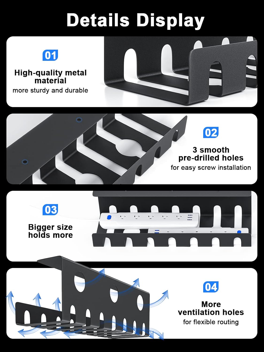 - 【Innovative design for heat dissipation】: The U channel desk cord organizer has 3 pre-drilled holes and multiple grooves and perforations, which not only facilitates the placement of plugs and cords, but also promotes heat dissipation of the equipment. These under desk cable management systems are suitable for different types of desks, including standing desks, adjustable desks, lift desks, glass desks, L-shaped desks, gaming tables and other common workspaces