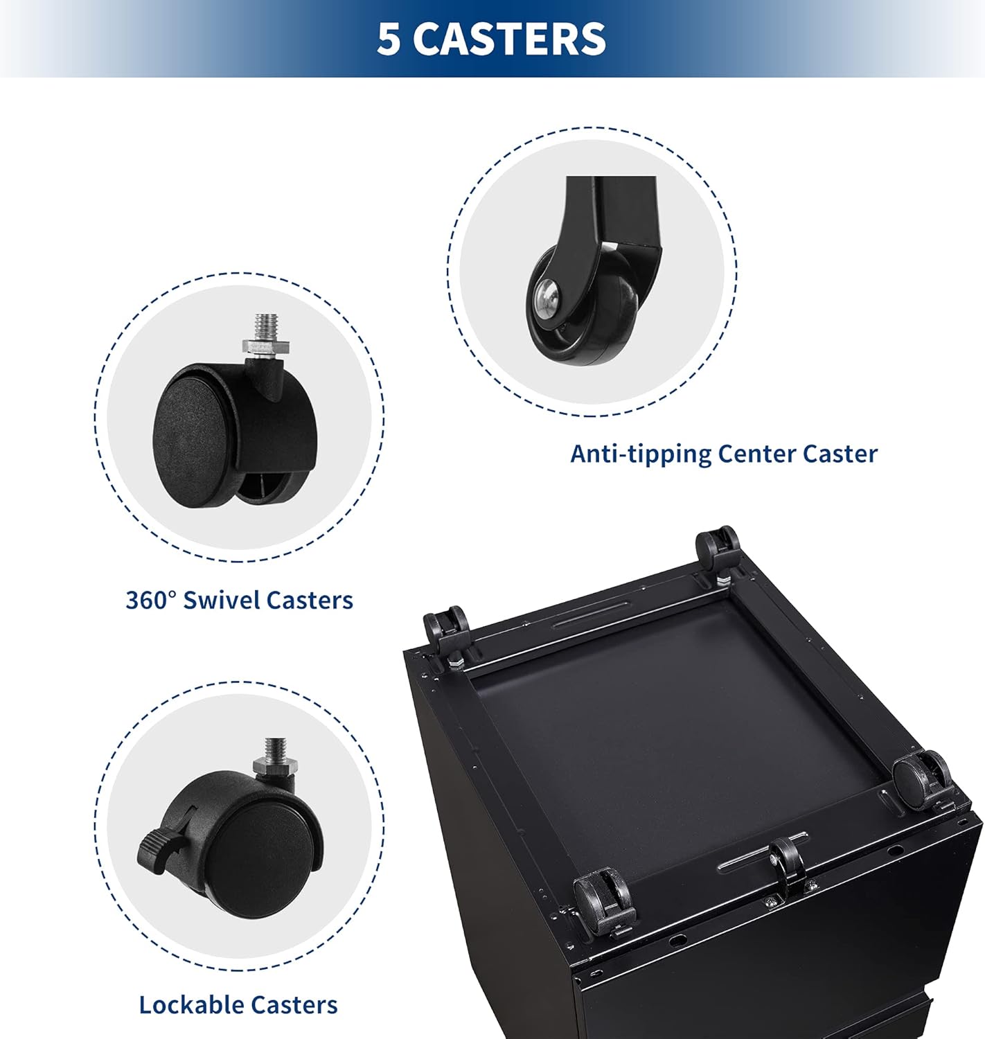 - Various wheel combinations: A total of five wheel combinations of 2+2+1 are used at the bottom of the movable cabinet. The design of 2 brake wheels can fix the file cabinet, and 1 anti-tipping wheel can protect the cabinet from tipping forward.