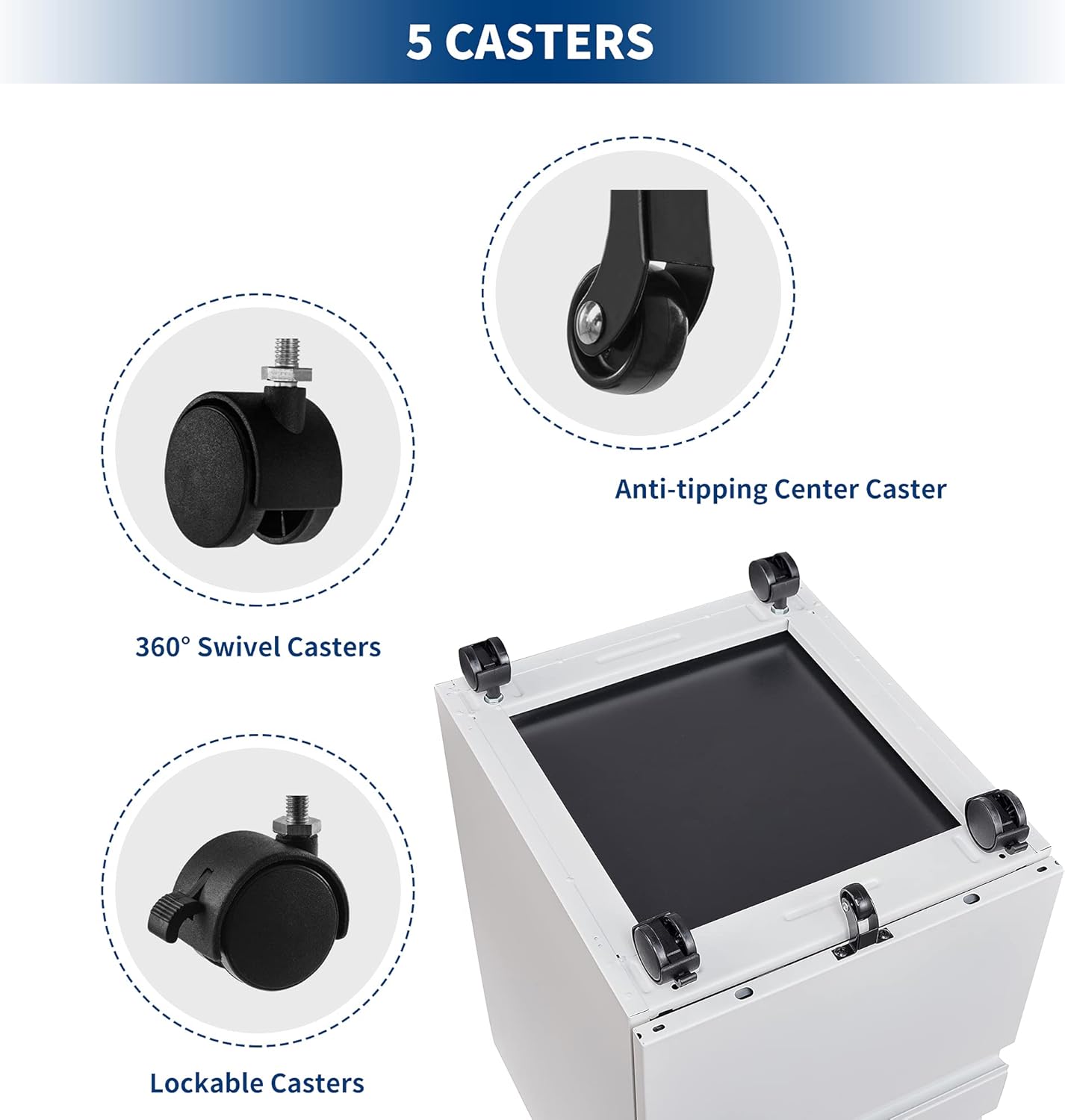 - Various wheel combinations: A total of five wheel combinations of 2+2+1 are used at the bottom of the movable cabinet. The design of 2 brake wheels can fix the file cabinet, and 1 anti-tipping wheel can protect the cabinet from tipping forward.