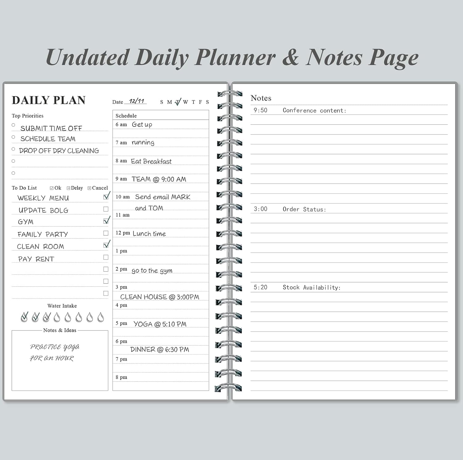 - Work Smarter with Daily Task Management - This daily planner undated each page includes space for 5 top priorities, 9 to do list,daily schedule from 6am-8pm, notes&ideas and water intake.Break your day into hours and help you work effective.
