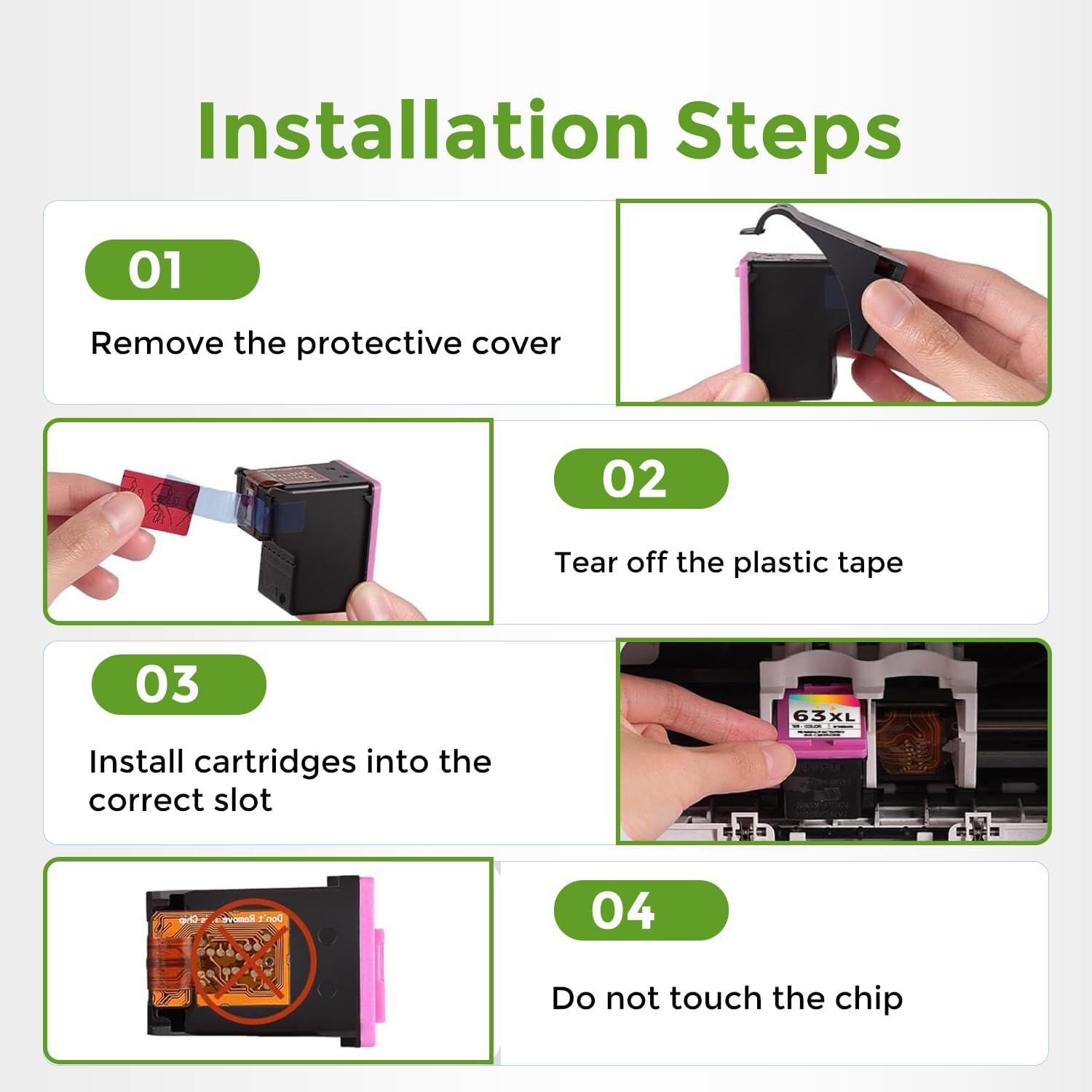 - Upgraded Chips: Each 63 xl black ink cartridge uses the latest enhanced chip technology to ensure efficient compatibility and fast identification with the printer, while ensuring that the printer is free from damage and hassle.