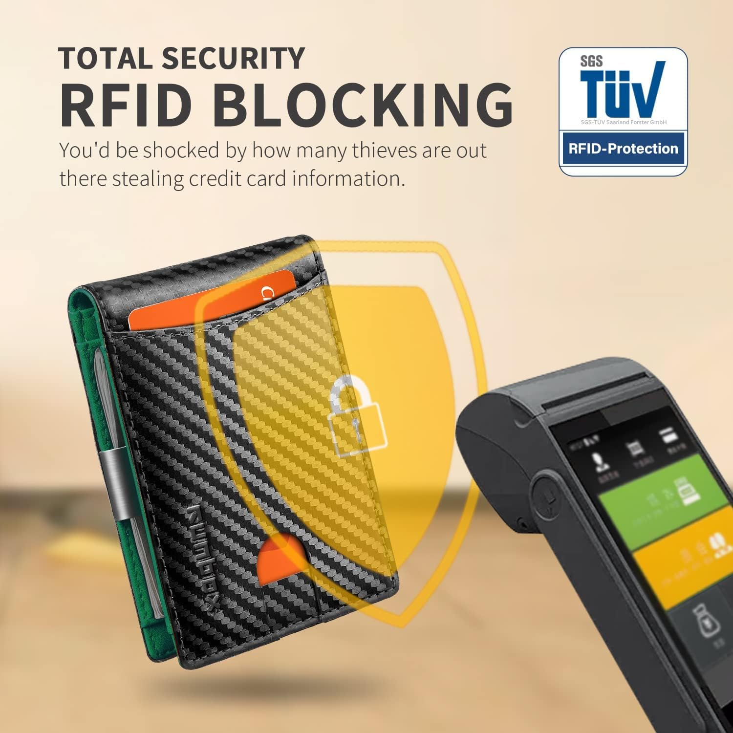 - RFID Anti-Theft SECURITY - This slim wallet for men is equipped with German Institute Certified RFID Security technology, a unique metal composite, engineered specifically to block 13.56 MHz or higher RFID signals to protect the valuable information and privacy