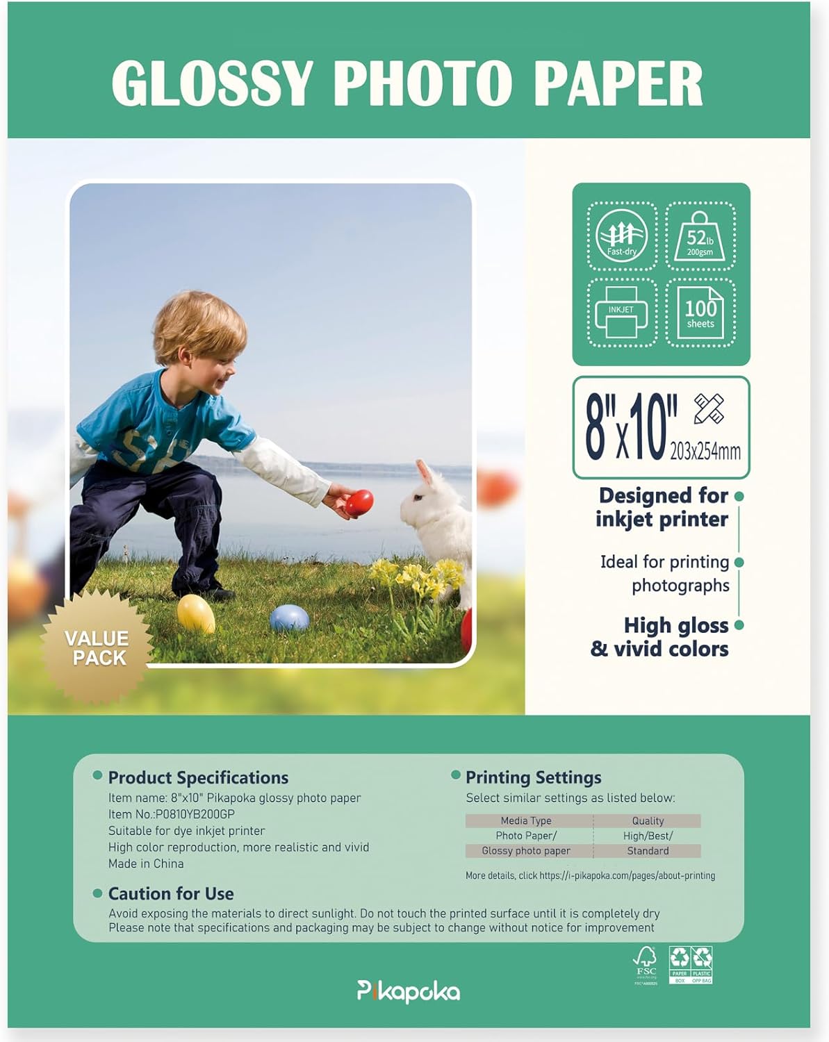 - Pikapoka glossy photo paper 52lb(200gm), size: 8x10 in, 100 Pack