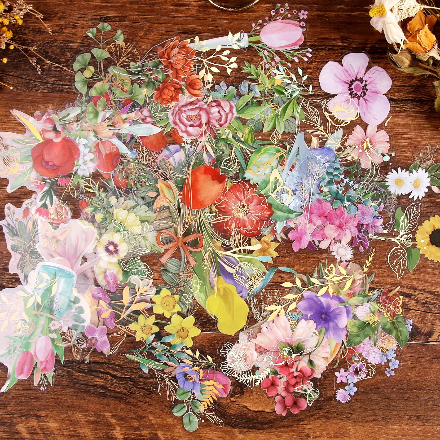 Dizdkizd Gilding Flower Stickers (240 Pieces) - Glitter Watercolor Transparent Stickers for Card Making Scrapbooking Envelopes Wrapped Gifts Arts and Crafts Journaling
