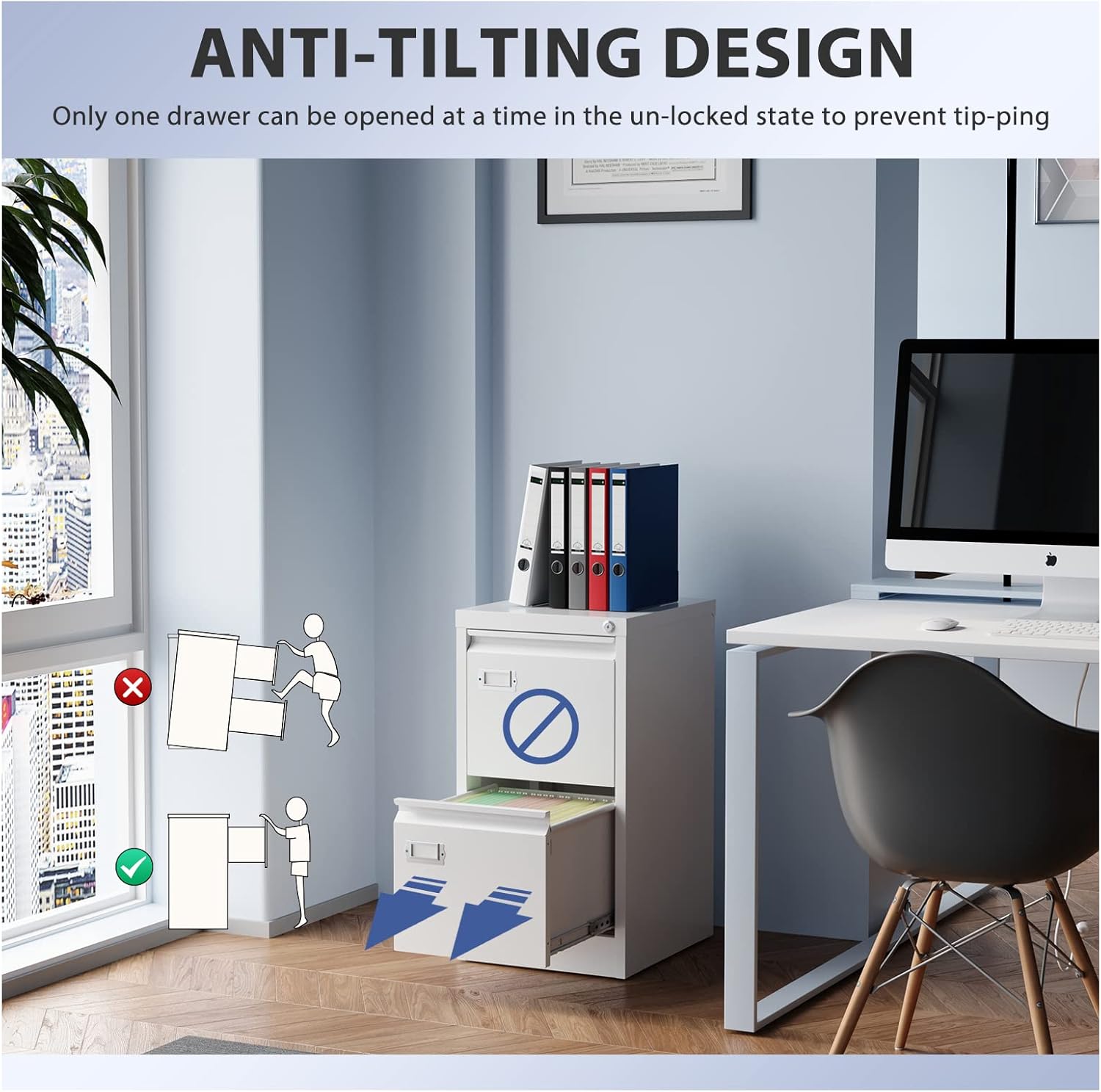 - ăAnti-Tilt DesignăThis office file cabinets has a lock that can lock all two drawers and comes with two keys. It helps you keep your valuables and documents safe. In the unlocked state, only one drawer can be pulled out at a time, preventing the movement of multiple drawers causing the overall center to shift and the box to fall.