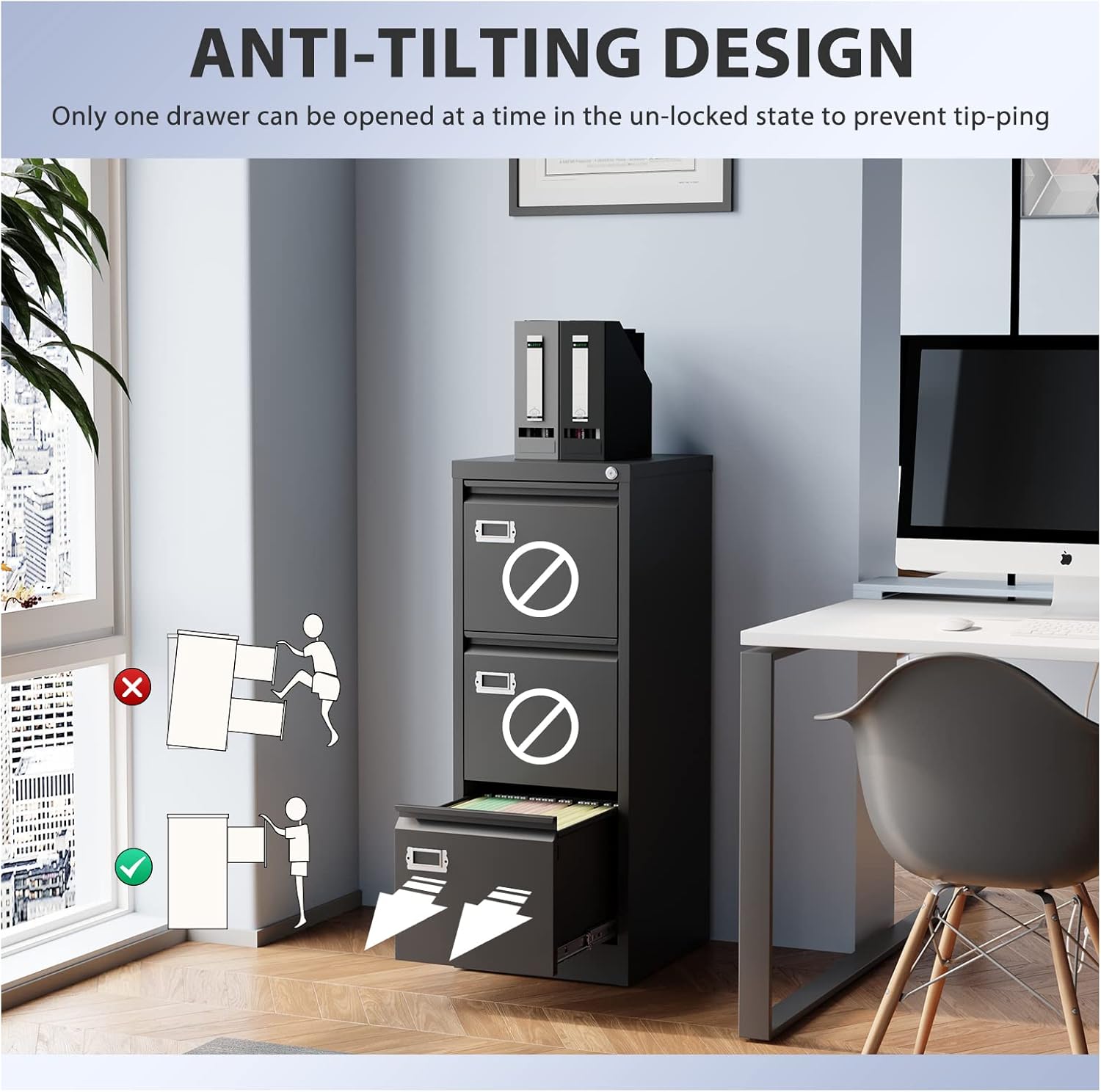 - ăAnti-Tilt DesignăThis office file cabinets has a lock that can lock all three drawers and comes with two keys. It helps you keep your valuables and documents safe. In the unlocked state, only one drawer can be pulled out at a time, preventing the movement of multiple drawers causing the overall center to shift and the box to fall.
