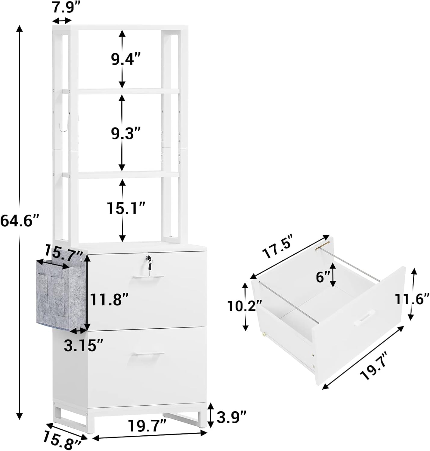 - 【Ample Storage Space】 19.68" L x 15.7"W x 64.56" H file cabinet is perfect for your home office. 6 tier shelf tall file cabinet provides enough room to hold bookshelf, printer, photocopier, etc. And side storage bag can hold books, file for your home office. The hook can be used to hang headphones, cap, etc.