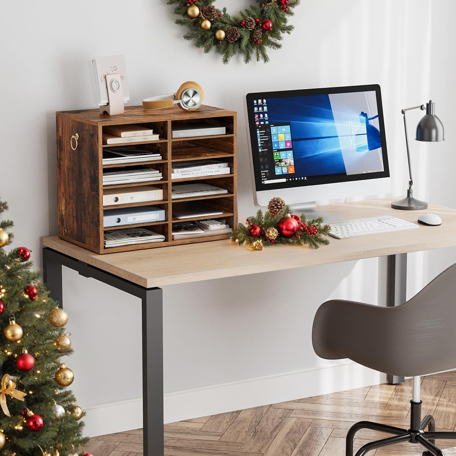HOOBRO Literature Organizers, 12 Compartments Office Mailbox with Adjustable Shelves, Wood Countertop Literature Sorter for Office, Home, Classroom, Mailrooms Organization Rustic Brown FG12WF01