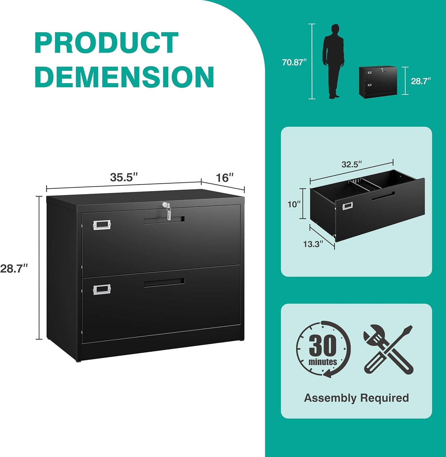 SISESOL 2 Drawer Lateral File Cabinet with Lock,Black Lateral Filing Cabinet,Horizontal Metal Filing Cabinet,Locked Wide Two Drawer File Cabinet for Office Home,Fit A4/F4/Letter/Legal File