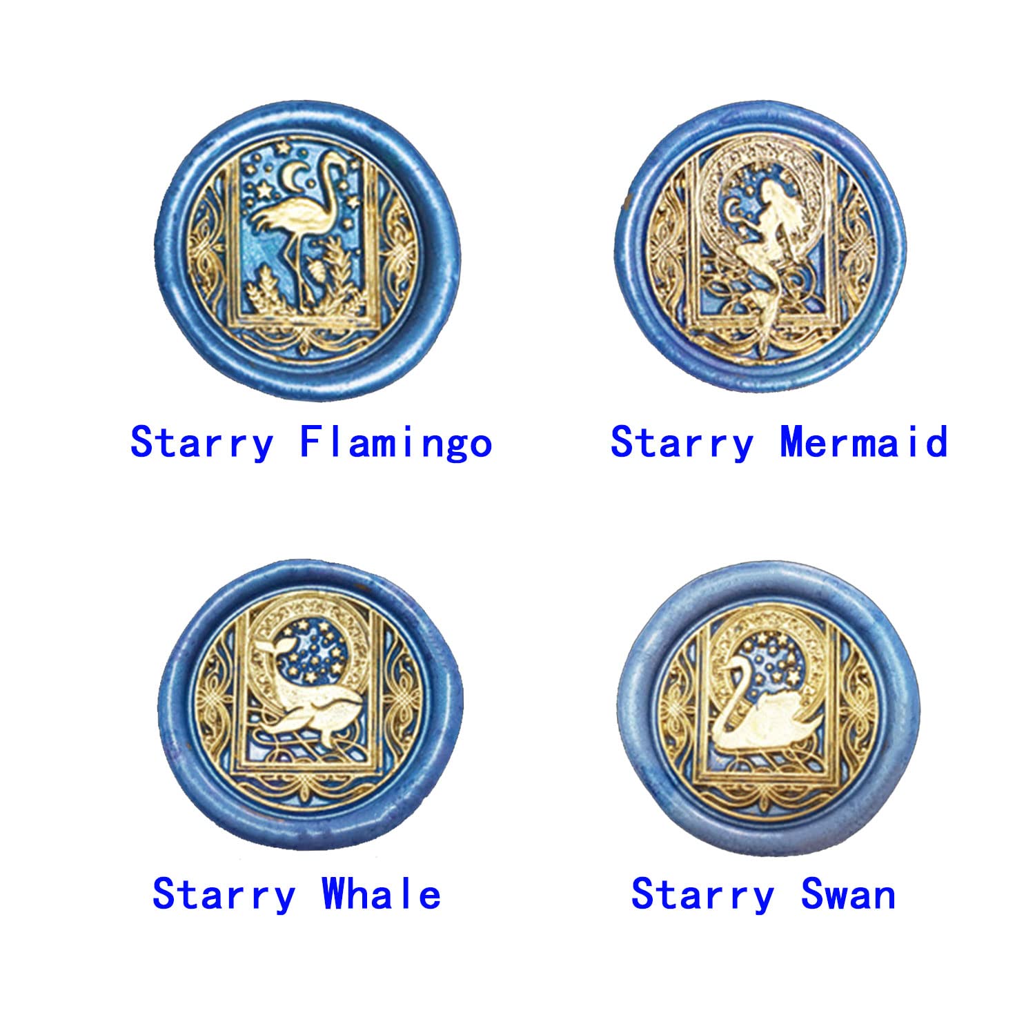 - [Package Includes] ANBOSE wax seal stamp kit includes 1 PCS Wooden handle,1 PCS Starry Mermaid wax seal stamp, 1 PCS Starry Whale wax seal stamp, 1 PCS Starry Flamingo wax seal stamp, 1 PCS Starry Swan wax seal stamp and 1 Gift box.