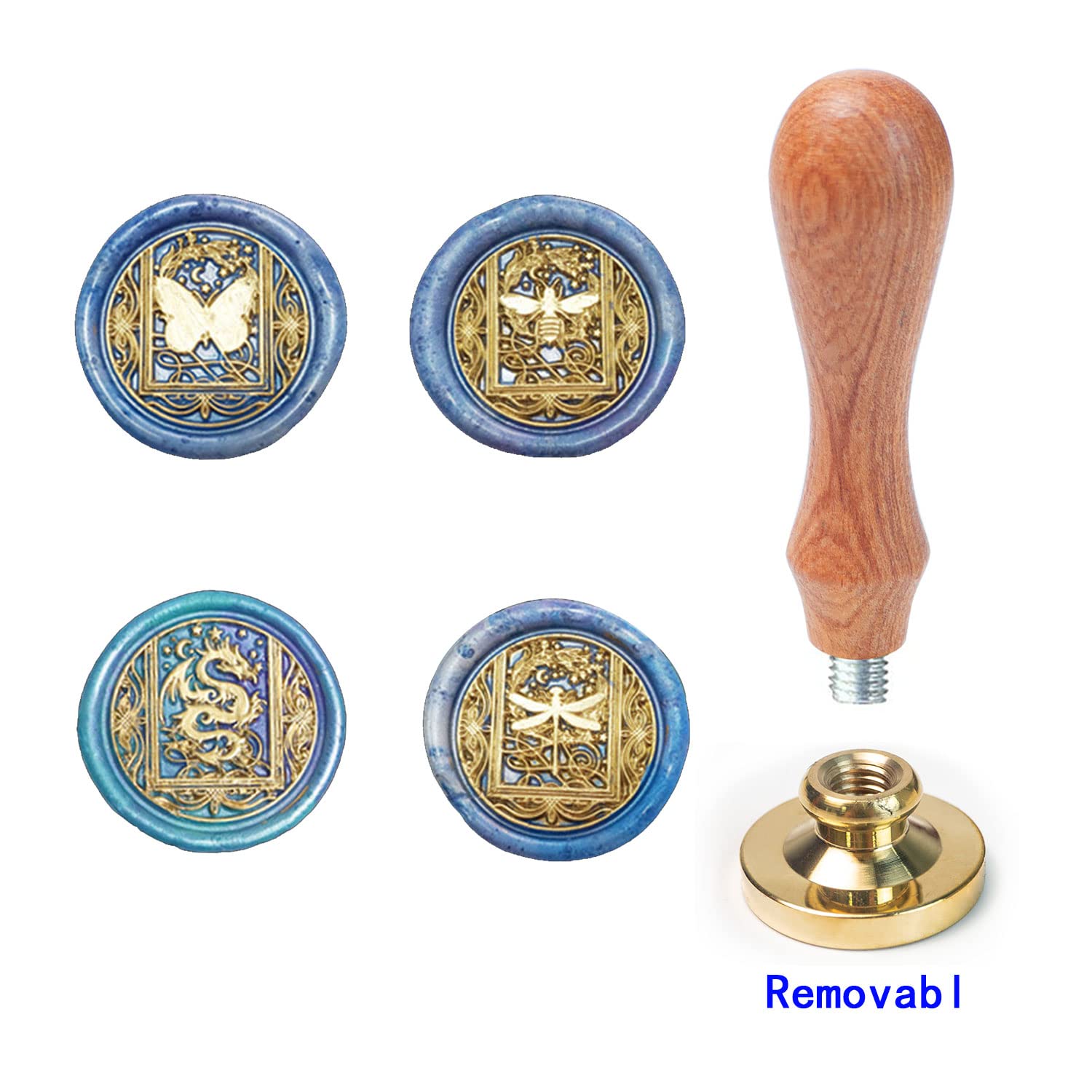 Animal Wax Seal Stamp Set with 4 PCS Removable Brass Heads and 1 Wooden Handle - Retro Starry Butterfly Dragonfly Bee Dragon Sealing Wax Stamp for Cards Invitations