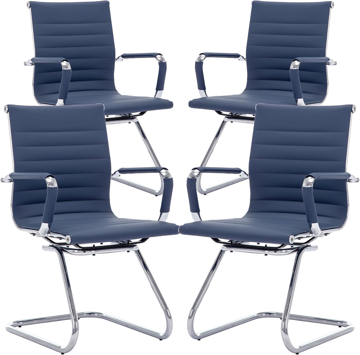 Office Desk Chair No Wheels Set of 4 PU Leather Computer Chairs Mid Back Guest Chairs for School Reception Conference Waiting Room, Navy Blue
