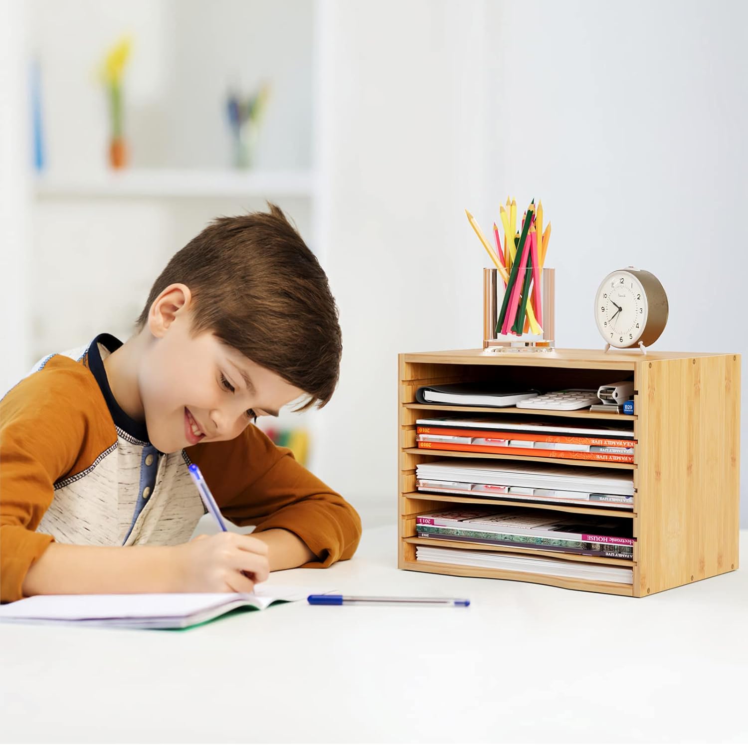 - 【NEAT YOUR DESKTOP】Help you to classify and store your various sizes of paper, file folder, magazines, staples, calculators, notebooks or any other documents, came with 4 MDF dividers can be adjusted freely according to your needs. Bamjoy file sorter organizer will make your home office, classroom, kids room much more organized.