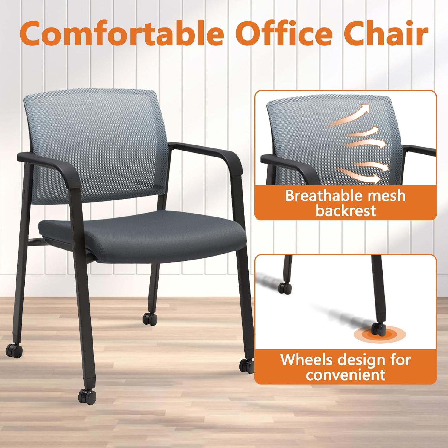 CLATINA Mesh Back Stacking Arm Chairs with Upholstered Fabric Seat and Ergonomic Lumbar Support for Office School Church Guest Reception (WithWheels Gray- 4 Pack)