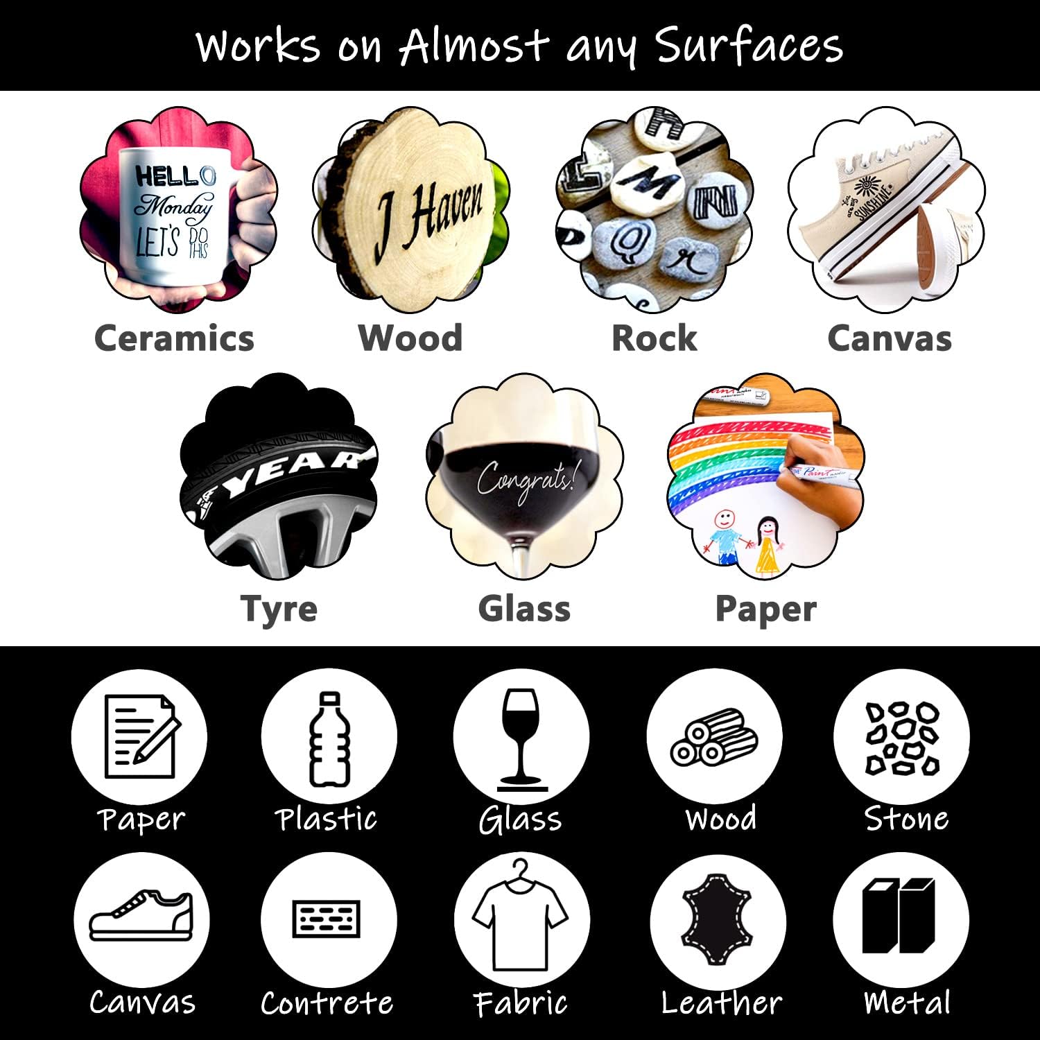 - Works on Almost any Surfaces: These permanent paint pen is the best choice to work on multiple surfaces. You can use on rock painting, ceramic, wood, leather, plastic, fabric, canvas, rubber, glass, metal and more