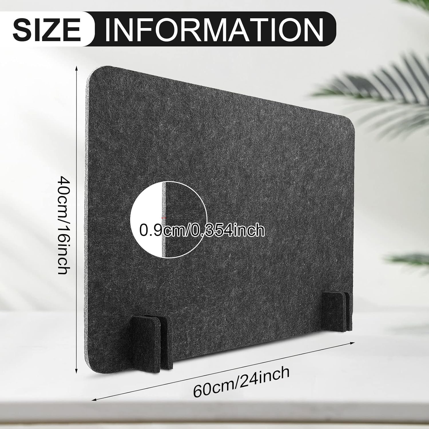 - Know More About Size: the panel of privacy desk dividers measures approx. 40 x 60 cm/ 16 x 24 inches, and the thickness is about 0.9 cm/ 0.35 inch, proper for you to use for your desk; The size of the support feet is about 10 x 7 cm/ 3.9 x 2.8 inches, which can match well with the panel, and makes the whole divider stand steadily