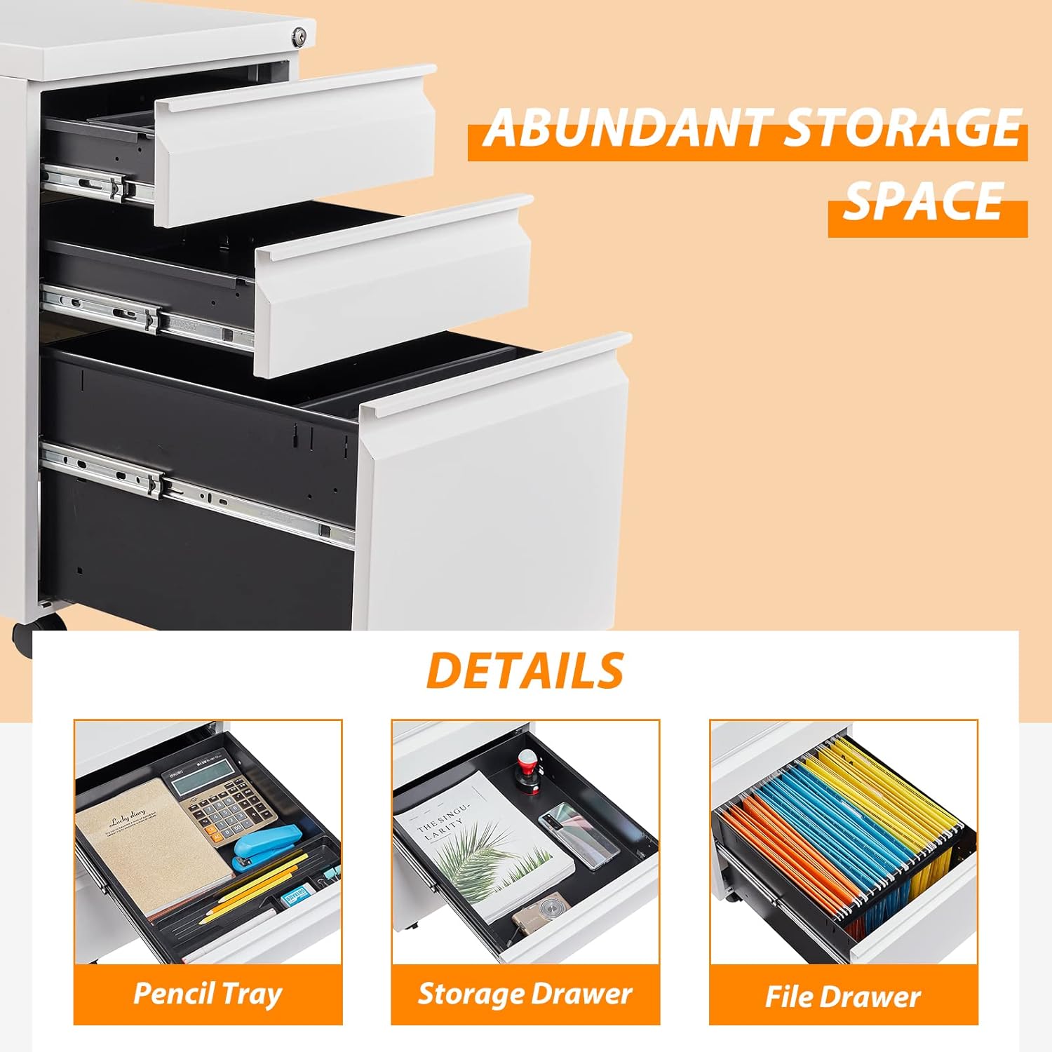 - 【Abundant Storage Space】: This mobile filing cabinet comes with 3 drawers with slide rails. Two drawers at the top to store your bags, phone or other everyday items and papers. Bottom drawer with adjustable shelf, ideal for letter, legal, A4 folders, to meet your different needs.