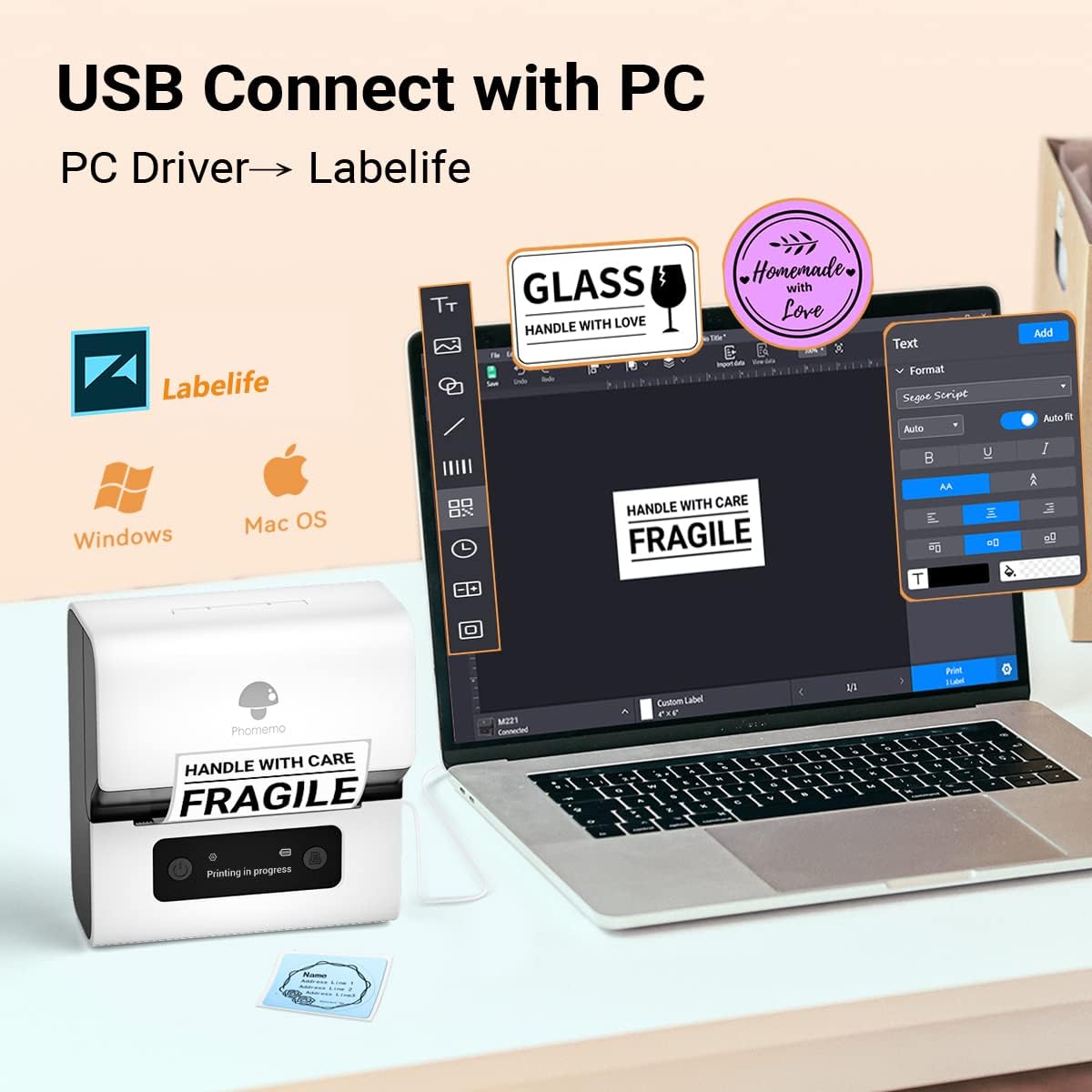 - Strong Compatibility- Bluetooth label maker connection with up to 33 feet range, 2 seconds to fast connect it. Stable Bluetooth 4.2 for phone and pads. M221 label maker also for USB connection for Mac OS and Windows 10. (Please follow the software installation guide)