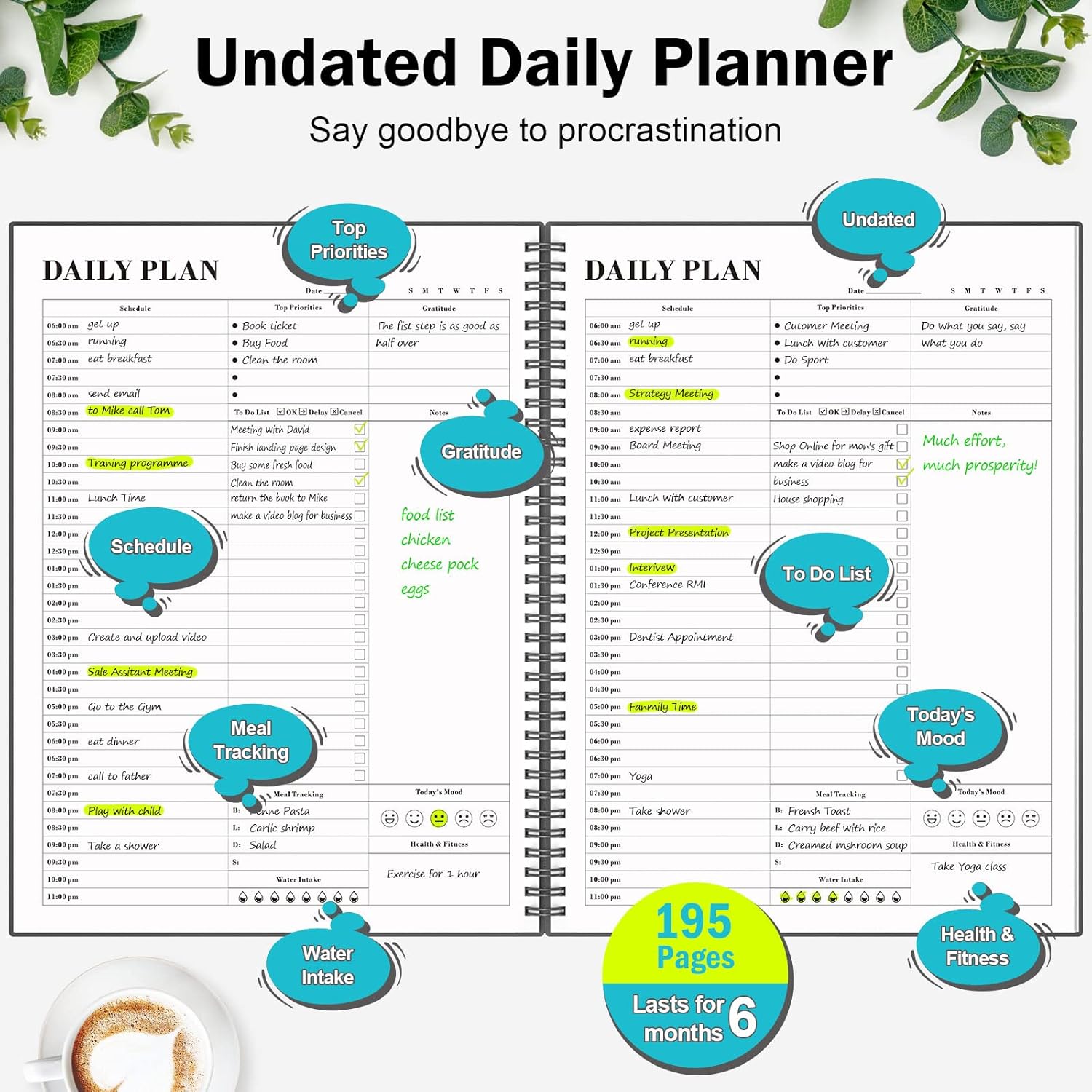 - Start Plan Anytime: The day planner is undated,if you miss a day or you are off of work that day you don’t need to waste a page, start to use this schedule planner any time.