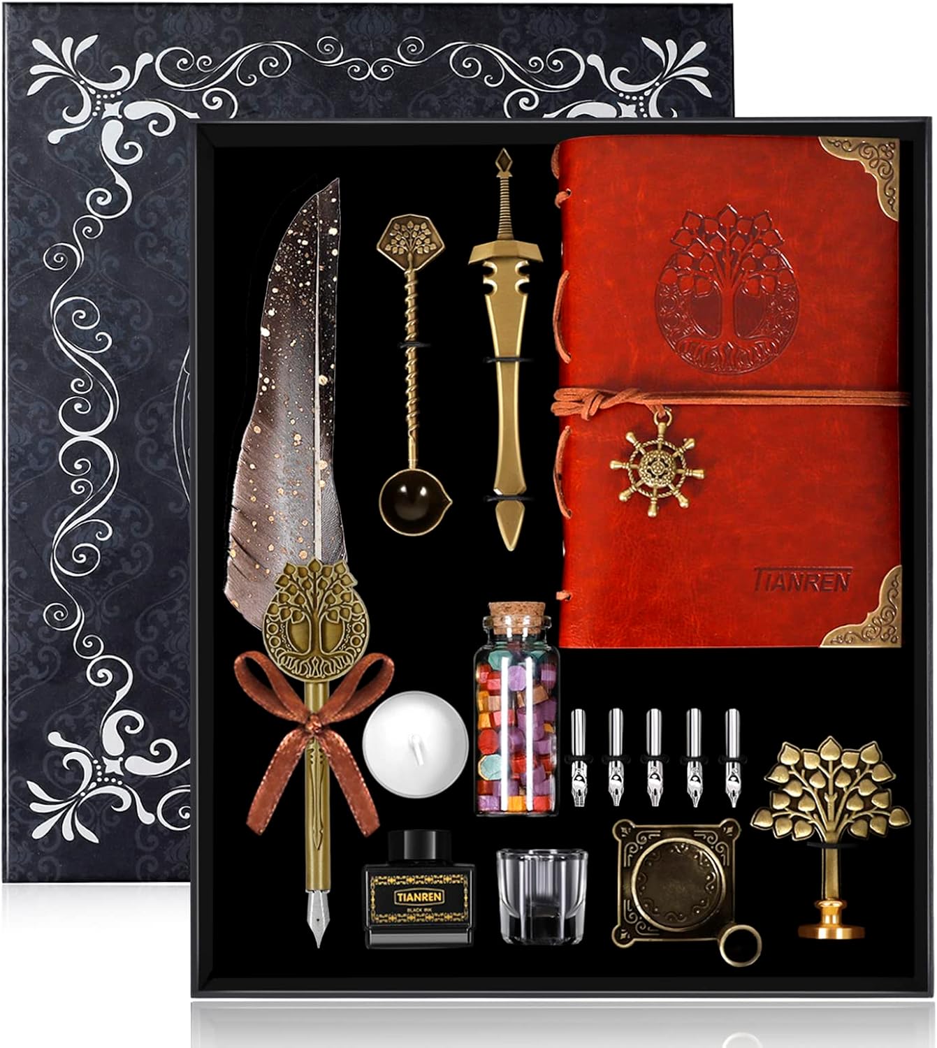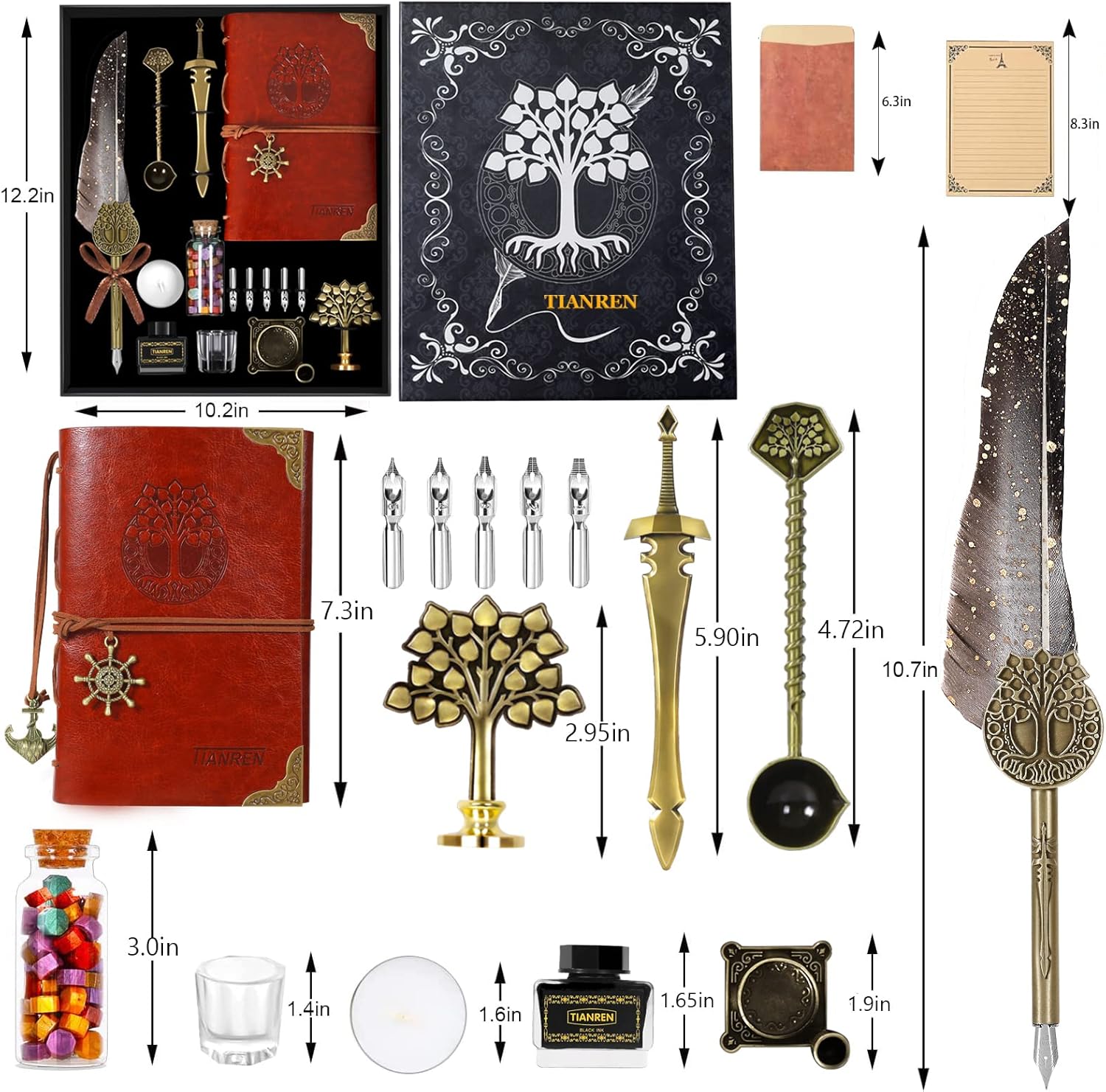- 【Calligraphy Pen Set Included】-1 x feather dip Pen, 1 x bottle of black Ink,1 x bronze pen holder,1 x metal wax seal stamp,1 x bottle of wax sealing beads,1 x glass cup,1 x bronze wax melting spoon,1 x bronze letter opener,5 x different sizes stainless steel replaceable nibs,1 x round white wax,1 x refillable pu leather notebook,1 x vintage envelope,1 x vintage writing paper,1 x unique gift box,the TIANREN antique quill pen ink set meets everything you need it.