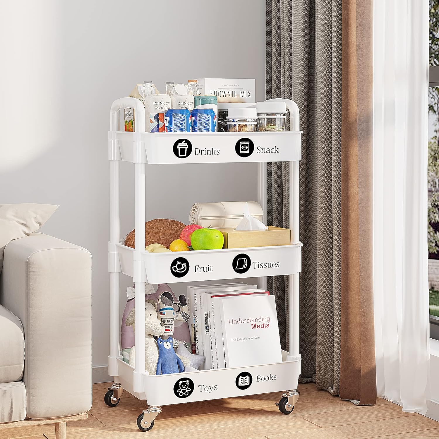UDEAR 3-Tier Rolling Utility Cart with 12 Category Labels,Multifunctional Storage Shelves with Handle and Lockable Wheels for Room,Office,Kitchen,Bathroom,White