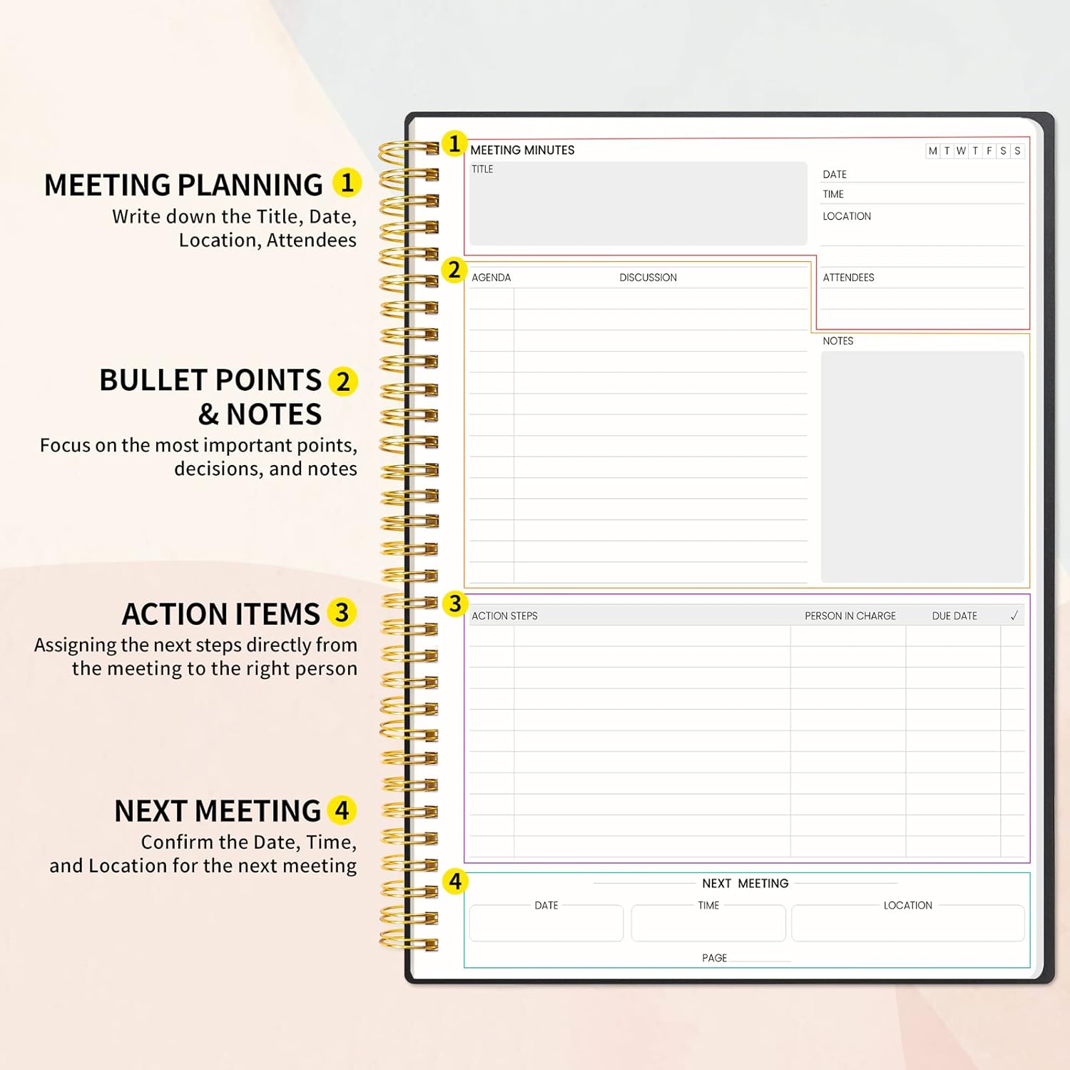 - Better Tool Drives Better Meetings: The hassle of organizing the chaotic meeting notes VS this professional meeting notebook. Definitely a step up! Everything is neatly zoned on each page makes it a breeze to fill them out and ensure all you need are accounted for. Each meeting journal comes in exclusive protective packaging and accompanying by our client service commitment to your utmost satisfaction.