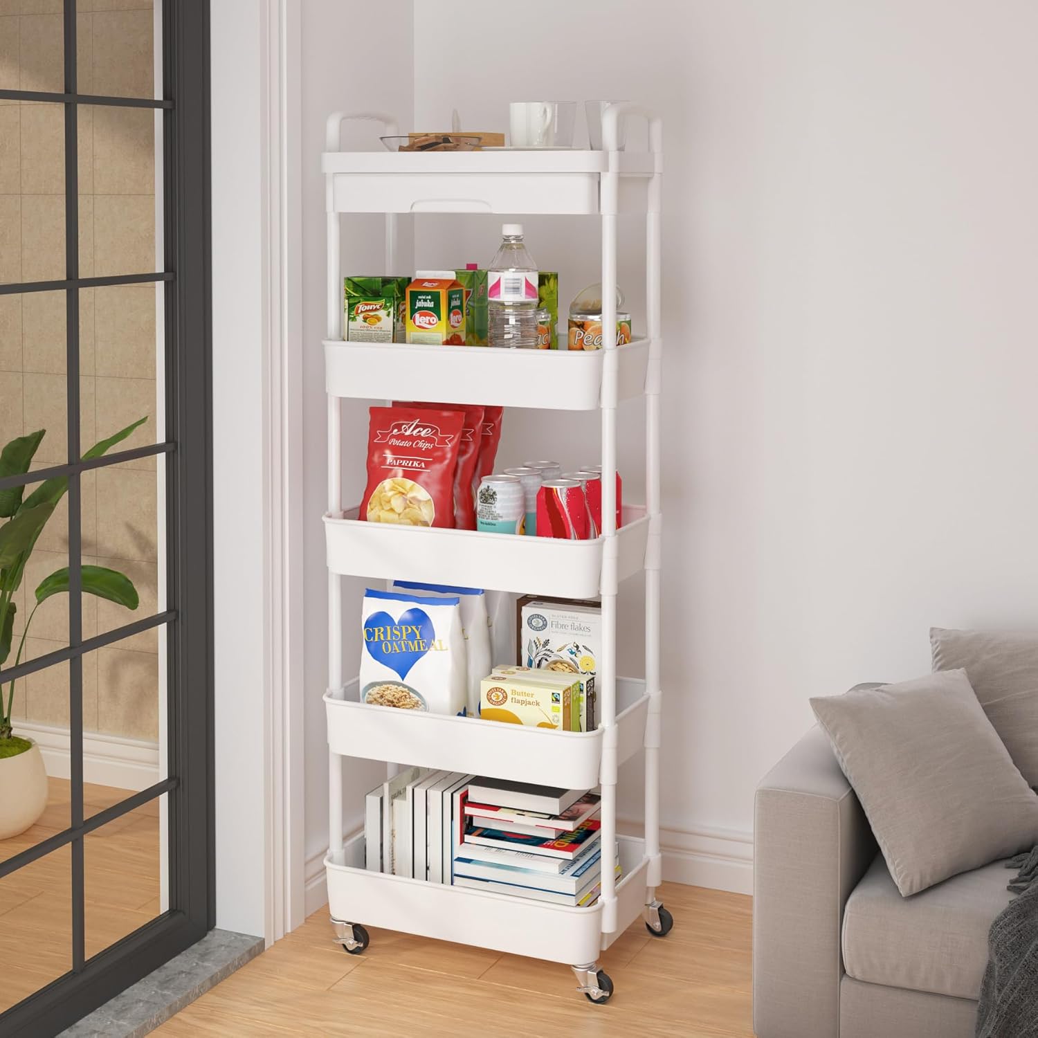 Calmootey 5-Tier Rolling Utility Cart with Drawer,Multifunctional Storage Organizer with Plastic Shelf & Metal Wheels,Storage Cart for Kitchen,Bathroom,Living Room,Office,White