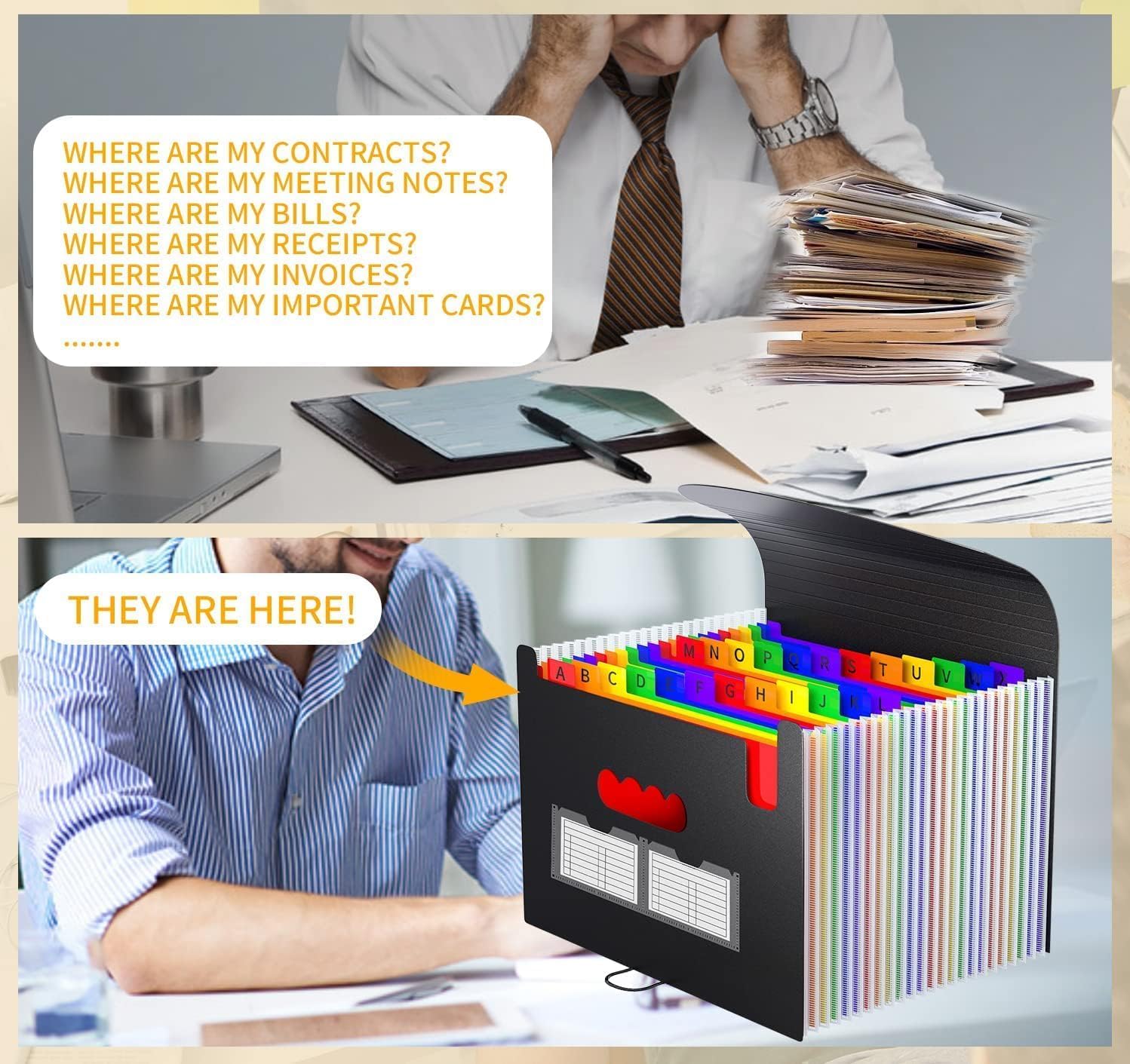 - 📂LARGE CAPACITY: The height of the color expanding file folder has been upgraded to fit all A4 documents and letter-sized documents. The paper can be perfectly placed in the page without blocking the label. 24 pockets can be used to store your documents and can hold more than 3,000 sheets of paper.