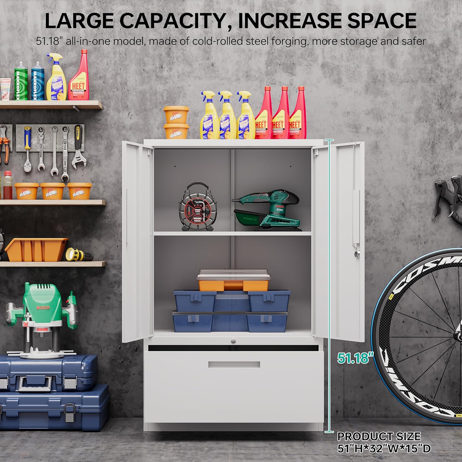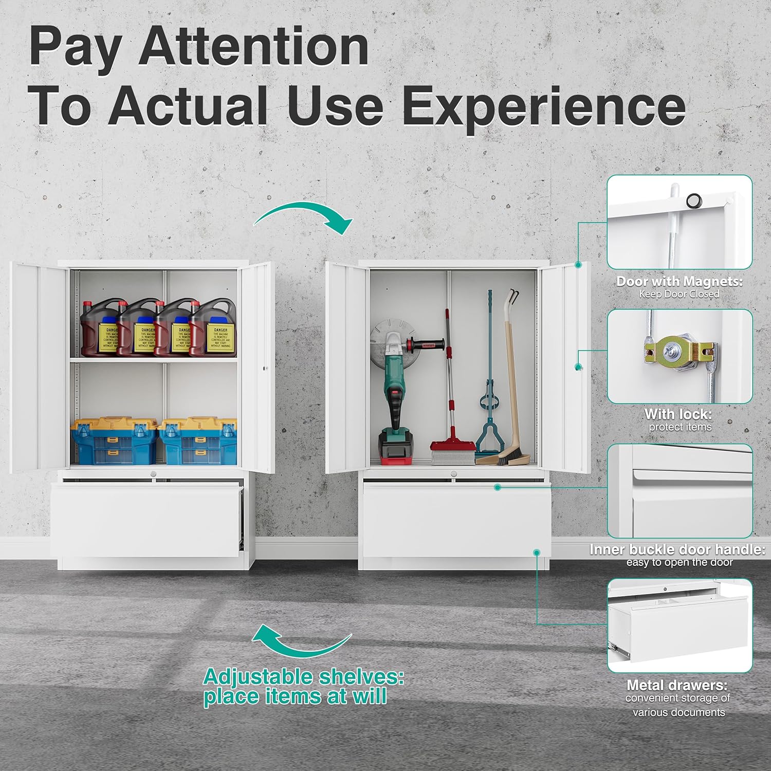 - 【Lockable Storage Cabinets】 Our file cabinet with lock & 1 adjustable shelf for a great fit & convenience. 1 large metal drawers for letter, A4, legal size hanging folders, high end unlocks to protect valuables including keys. Whatever your storage needs, you can create a unique storage space that suits them