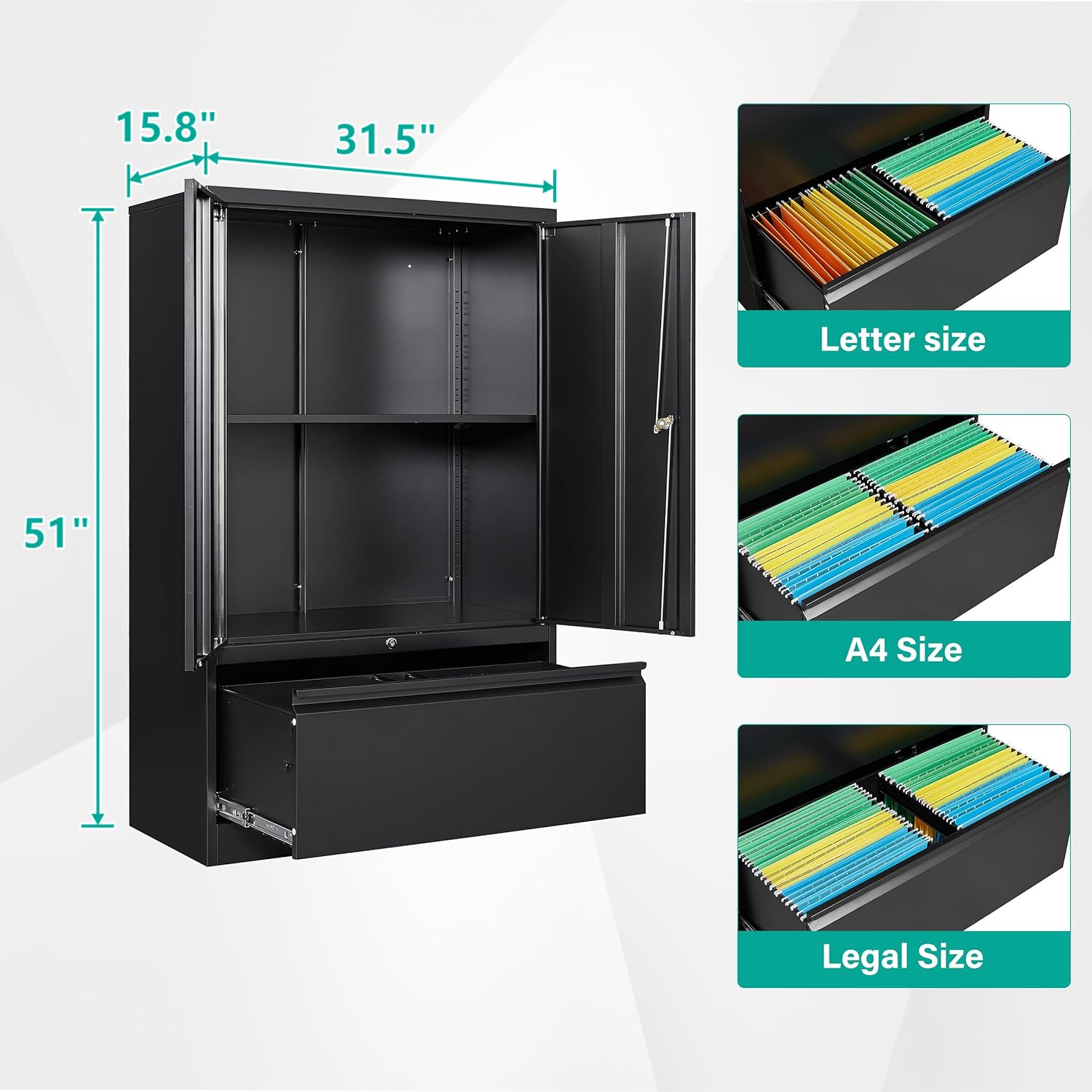 SISESOL Black Lateral File Cabinet with Lock,51" Locking Filing Cabinet with Doors and Shelves,Metal Storage Cabinets with Drawer for Home,Office,Garage,School,Fit A4/Letter/Legal File (1 Drawer)