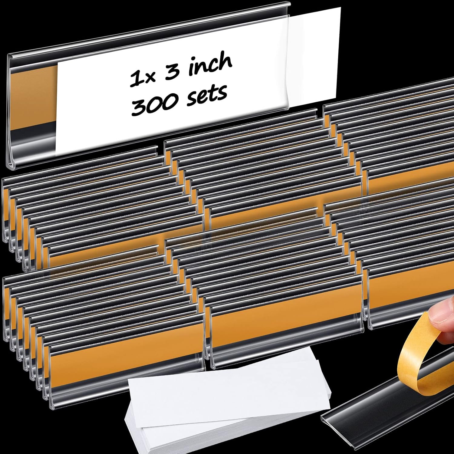Yexiya 300 Pieces 3 x 1 Inch Self Adhesive Label Holders with Paper Label Inserts Clear Shelf Tag Label Holders Plastic Price Tag Holder for Supermarket Library Bookshelves Mailbox Storage Bins