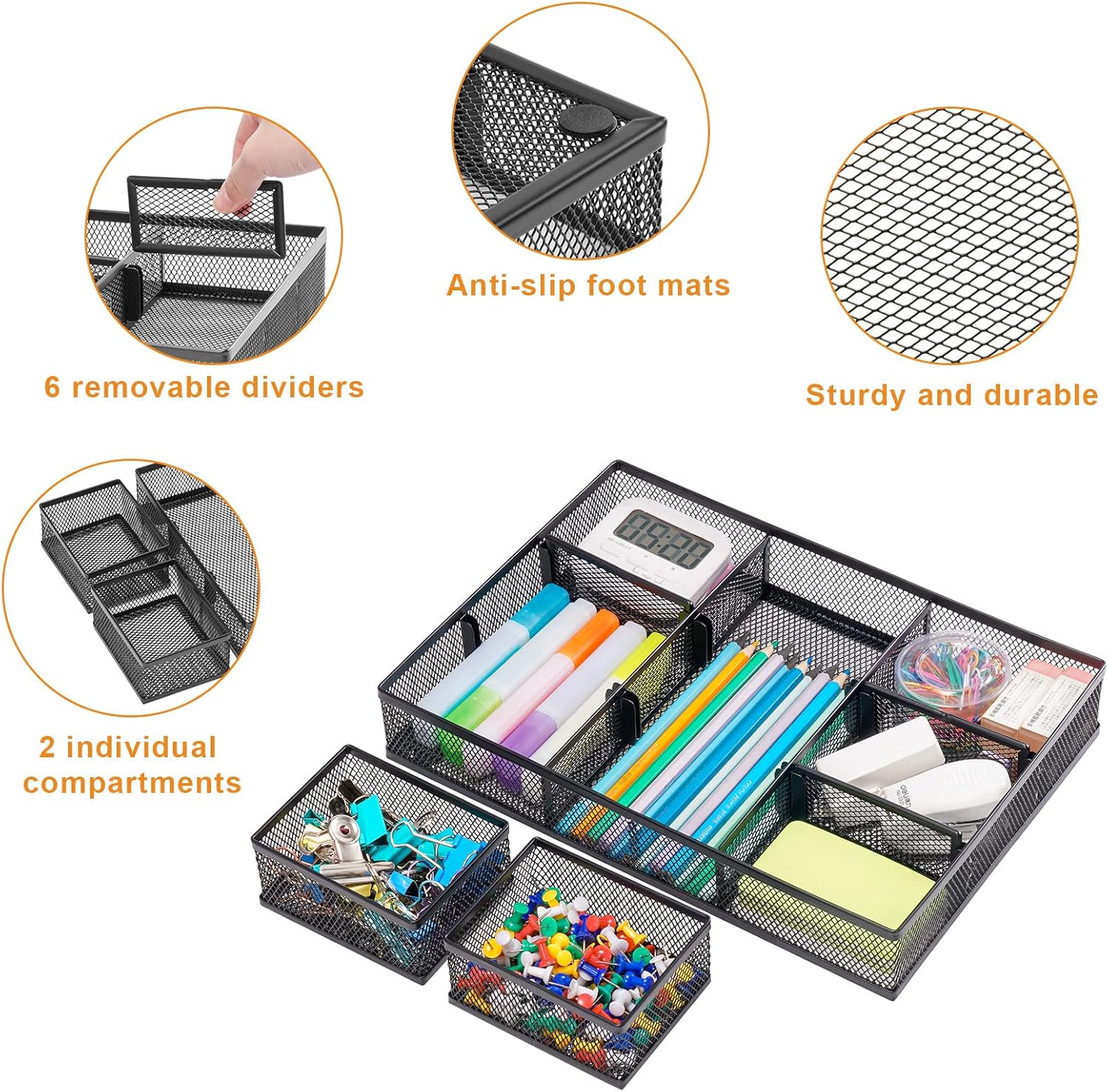 Marbrasse 3 Packs Desk Drawer Organizers, Metal Mesh Dividers Desk Drawer Organizer Tray with 9 Adjustable Compartments, Pen Organizer for Drawer Tray Box Accessories for Desktop,Kitchen, Makeup