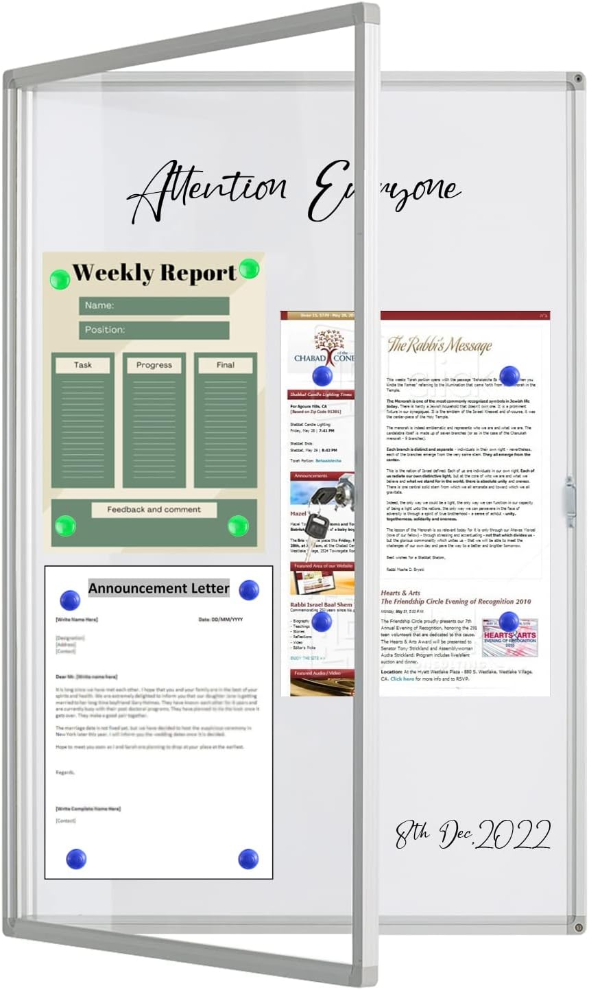 - Crystal-clear acrylic door allows direct marker writing, while the inner magnetic surface accommodates notes, flyers, or schedules. Use as a standalone bulletin board, whiteboard, or hybrid solution for dynamic communication.
