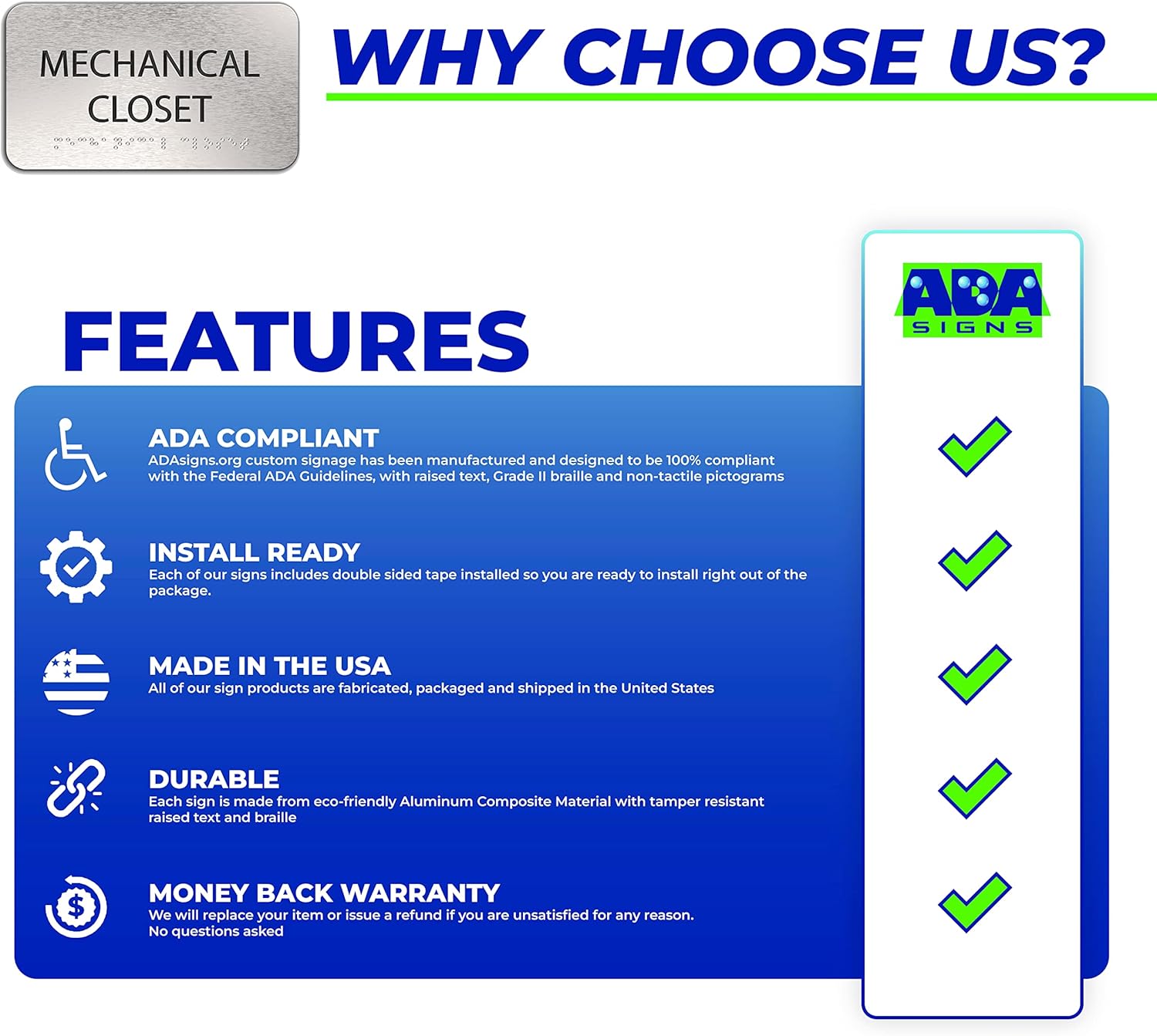 ADASigns Mechanical Closet Sign 7" W x 4" H - Durable Brushed Aluminum with Grade 2 Braille - Easy Installation with Strong Double-Sided Tape - ADA Compliant Office Door Signs for Businesses & Offices