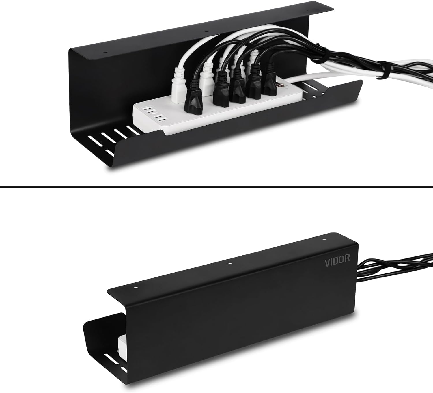 - Larger Capacity Cable Tray:The under desk cable management tray a length of 17",a depth of 4.8" and a height of 5".Our cable storage organizers have a larger capacity than those on the market and great for fitting multiple power bricks and lots of long cables.Big enough of space to not crush your plugs and cords.VIDOR cable management tray making your cord organization a snap.
