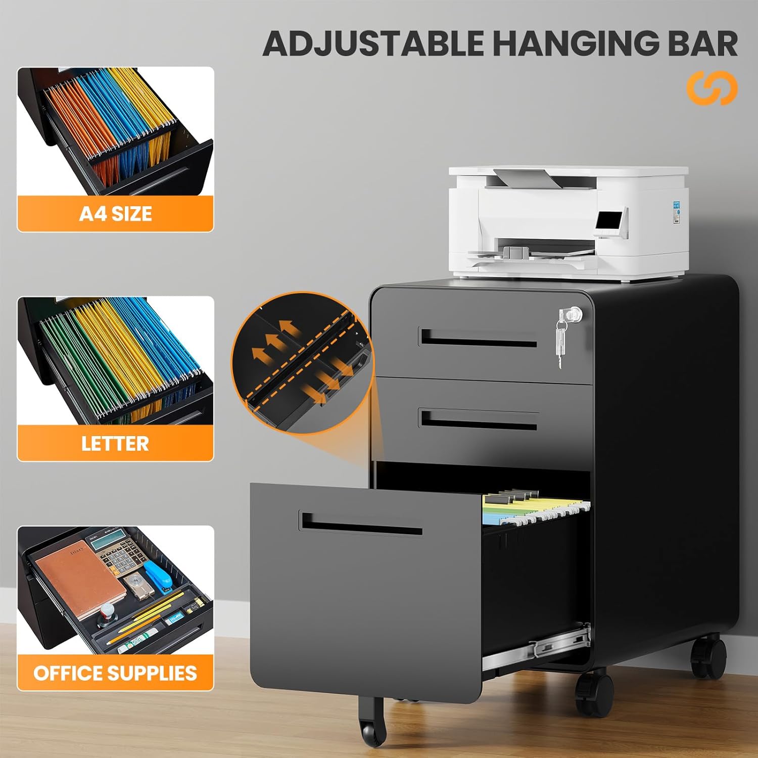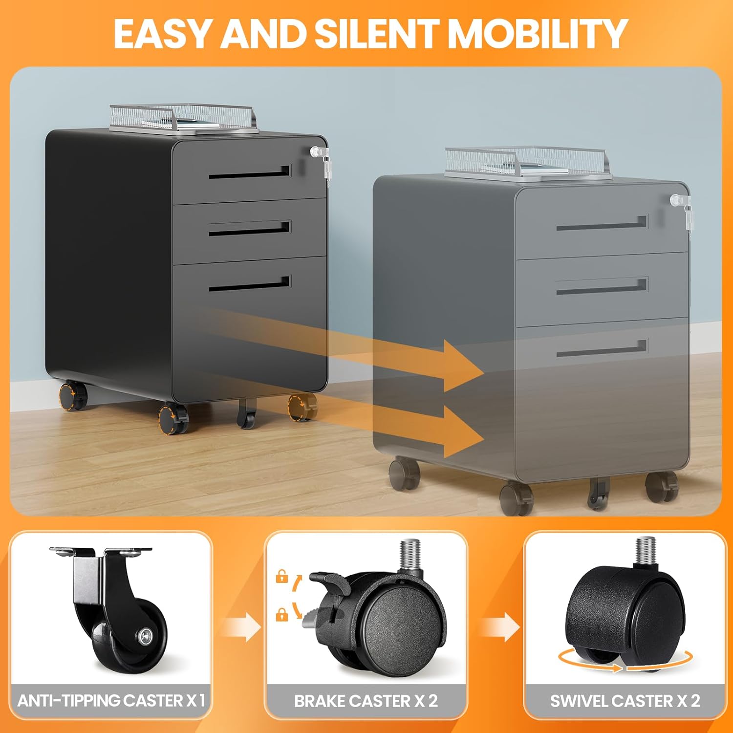 - ā¶FREE MOVABLE: This rolling file cabinet comes with 4 casters to move smoothly from room to room and adjust in the position freely, which can securely lock in place to prevent any unwanted movement and add stability.