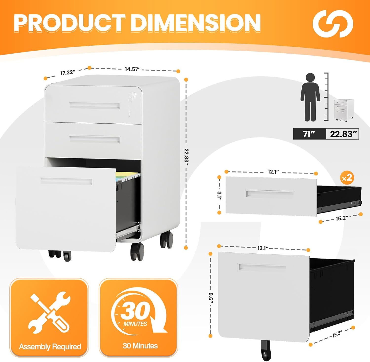 - FULLY ASSEMBLED & AFTER-SALES SERVICE: The file cabinet comes fully assembled except for the casters. If the Rolling File Cabinet arrives damaged, scratched, or missing part, or any Installation problems, please feel free to contact us. Overall dimension: 15.75"W x 17.72"D x22.83"H, Drawer size:12"W x 15.2" D x 9.6"H.