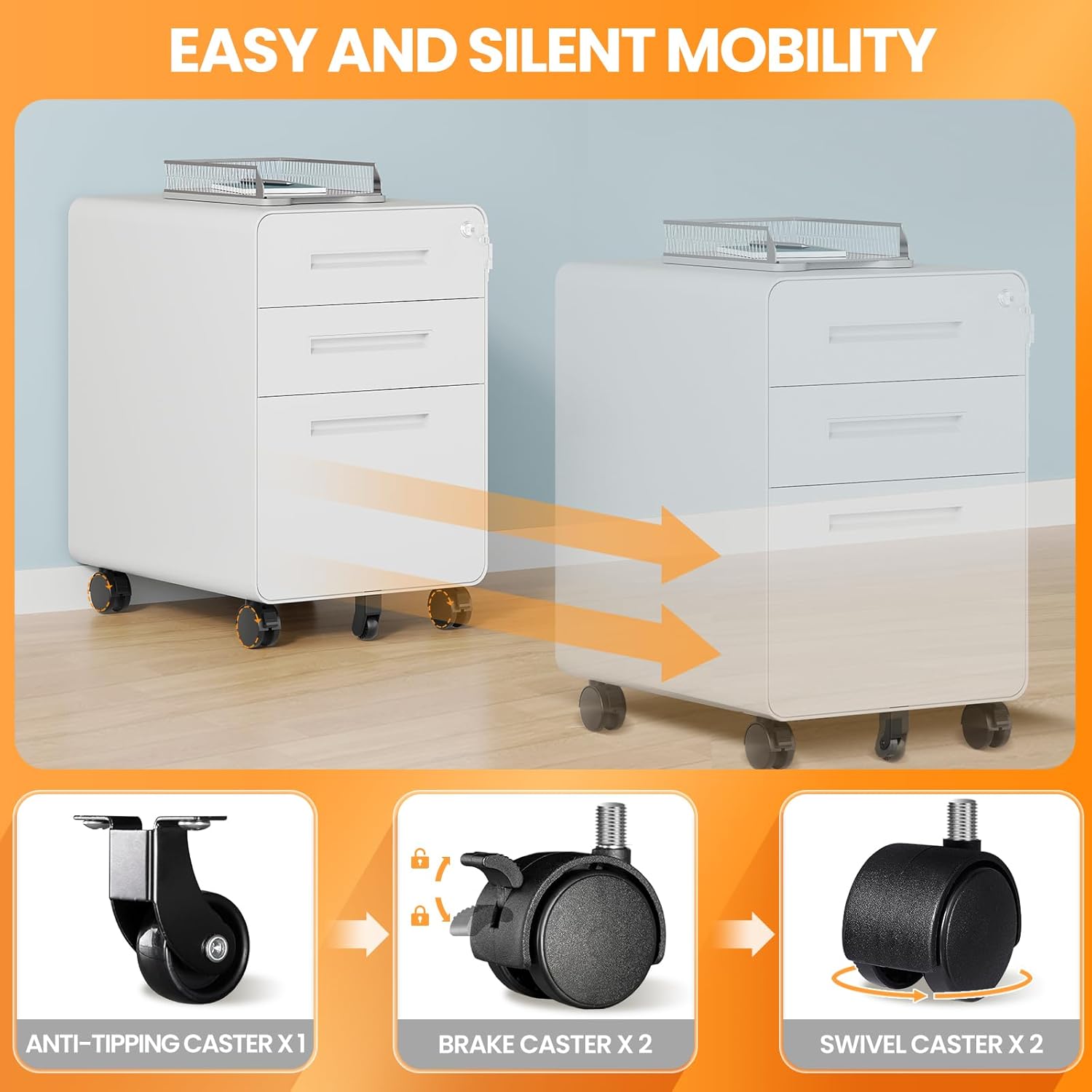 - ▶FREE MOVABLE: This rolling file cabinet comes with 4 casters to move smoothly from room to room and adjust in the position freely, which can securely lock in place to prevent any unwanted movement and add stability.