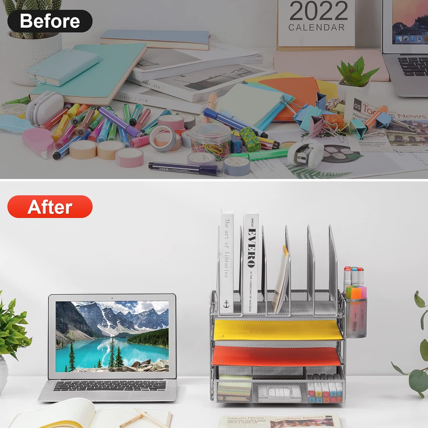 - 【Space Saving】Outfit your space with the Hanging Pencil Holder (Built-in Hooks) and top vertical file folder holder, which offers everything you need and make the most of your vertical and horizontal space to keep your desk neat so you can stay on task and do great work