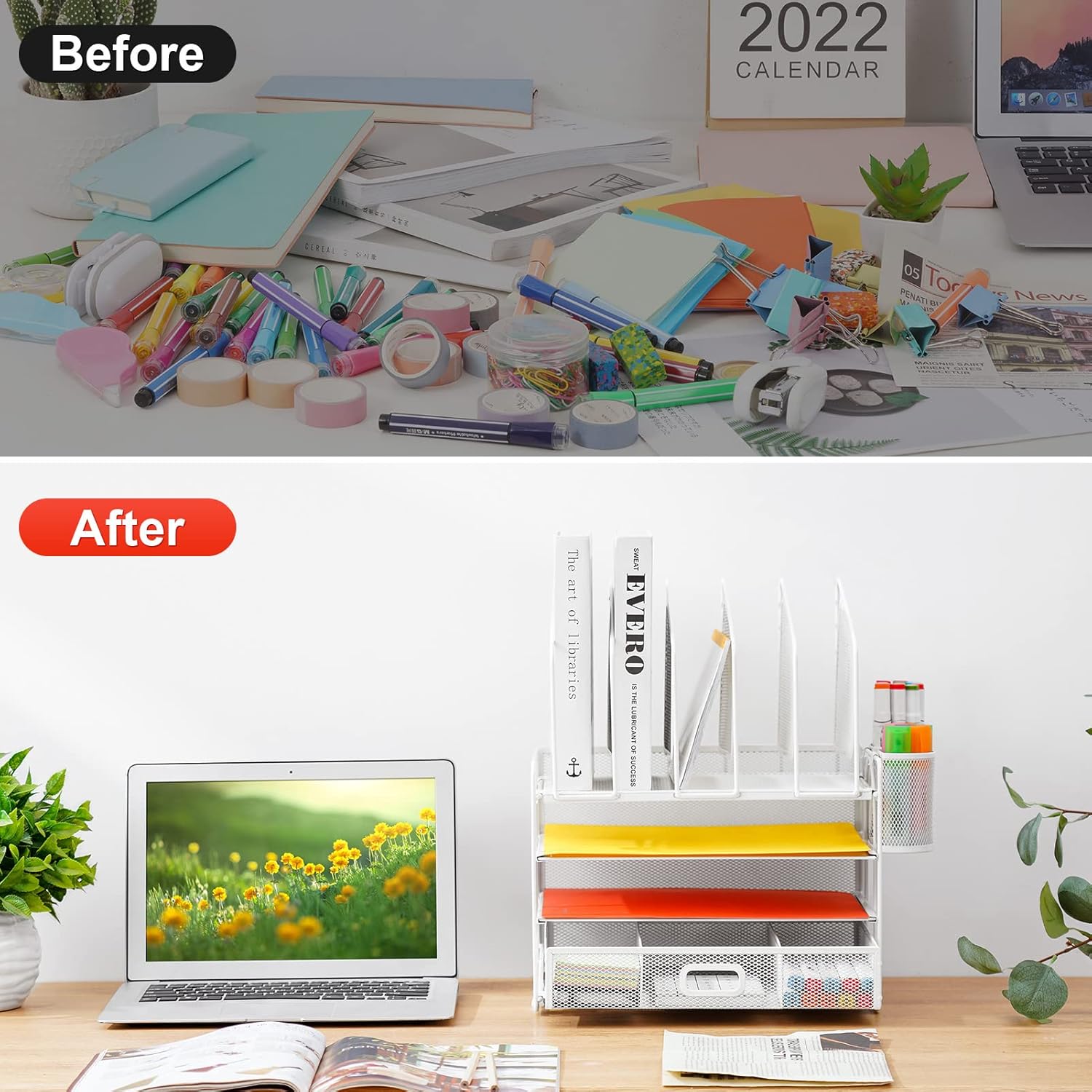 Marbrasse Desk Organizers, 4-Tier Mesh Desk File Organizer with 5 Vertical File Holders and 2 Pen Holders, Multifunction Desktop Organizer,Desk Organizers and Accessories for Home Office (White)