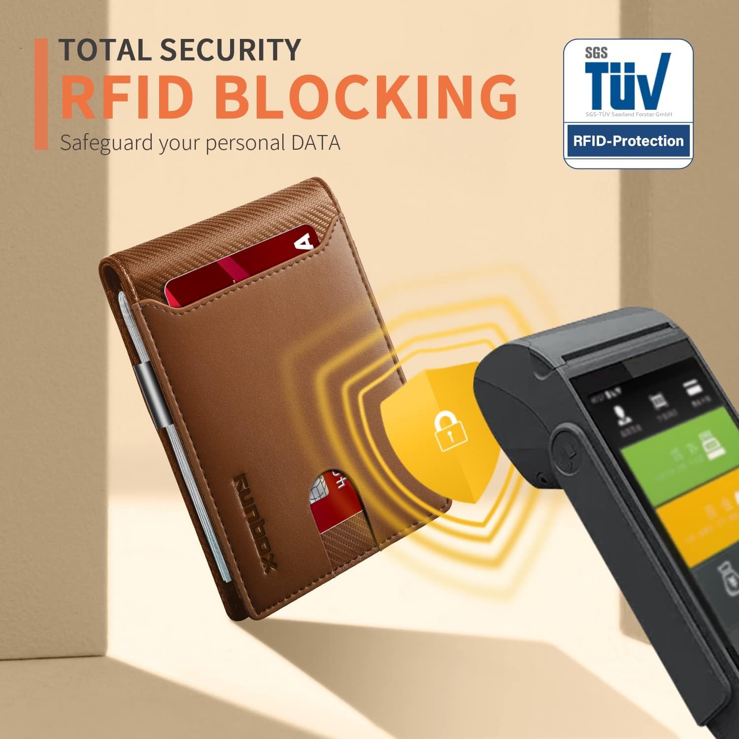 - ππ ππ ππ§ππ’-ππ‘πππ ππππππππ - this slim wallet for men equipped with German Instiute Certified RFID Security technology, a unique metal composite, engineered specifically to block 13.56 MHz or higher RFID signals to protect the valuable information and privacy
