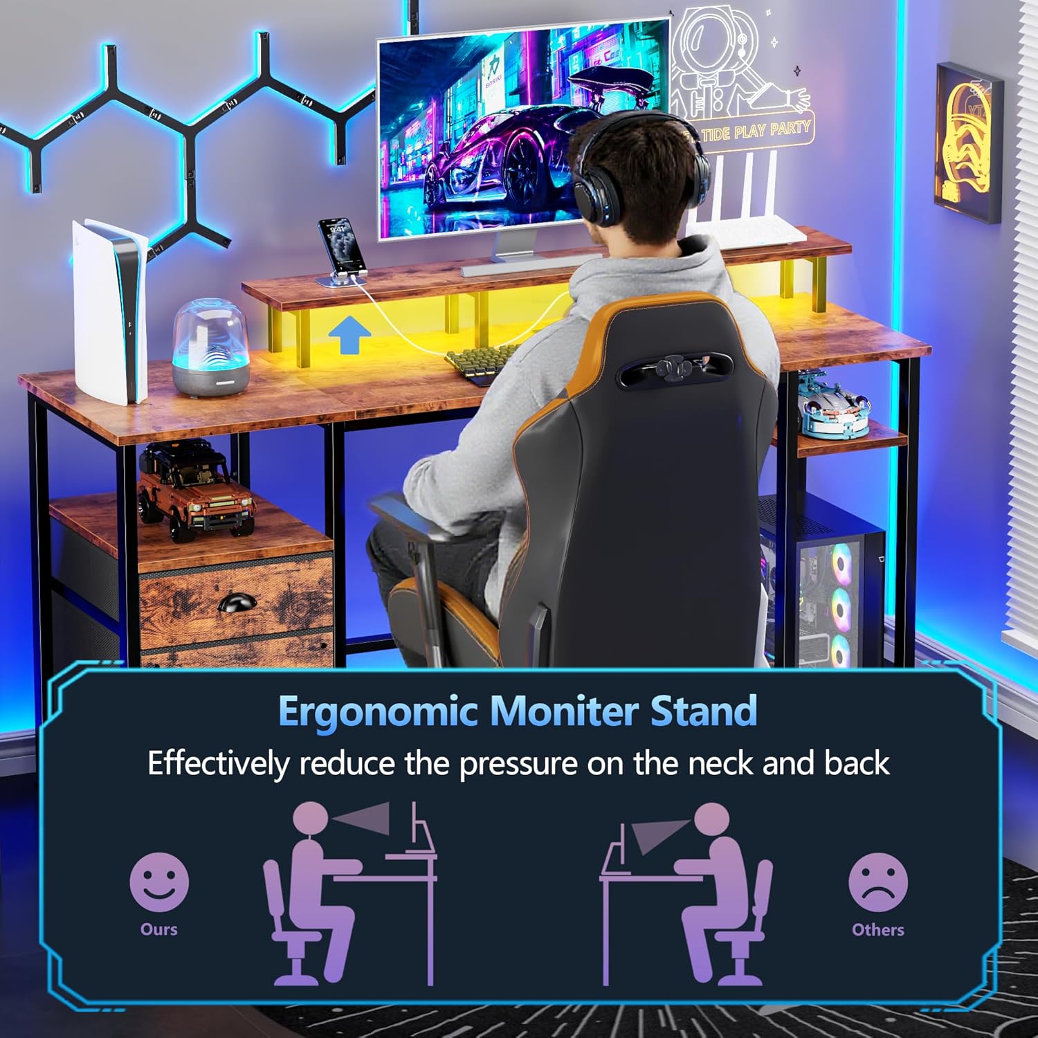Furologee 61" Computer Desk with Power Outlet and LED Lights, Desk with Fabric File Cabinet Drawer, Large Reversible Table with Shelves and Monitor Stand, Writing Study Table for Home Office